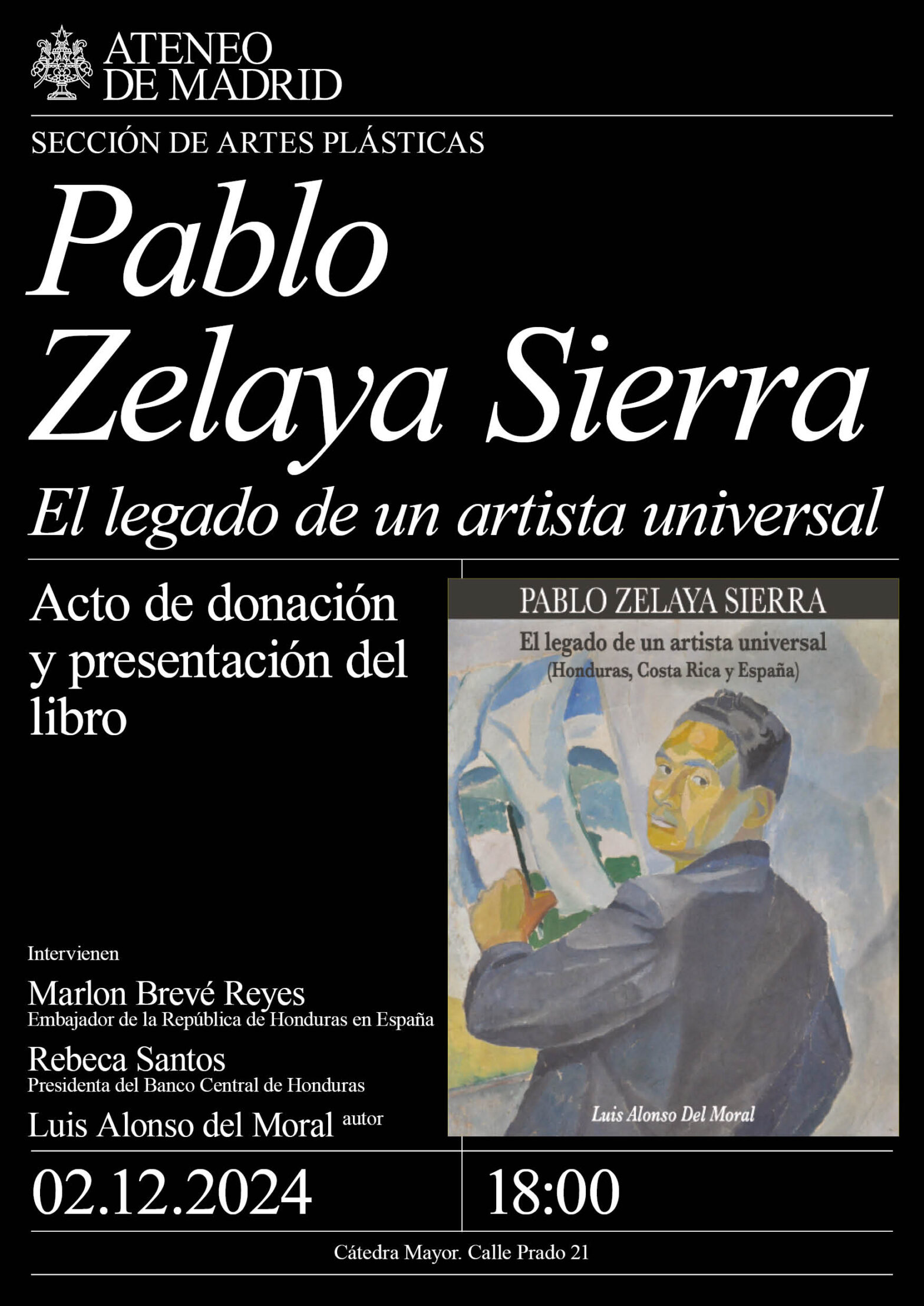Sección de Artes Plásticas. Intervienen: Marlon Brevé Reyes, embajador de la República de Honduras en España; Luis Alonso del Moral, autor del libro y donante del archivo familiar del pintor hondureño Pablo Zelaya Sierra; y Rebeca Santos, presidenta del Banco Central de Honduras. Cátedra Mayor. 18:00h.