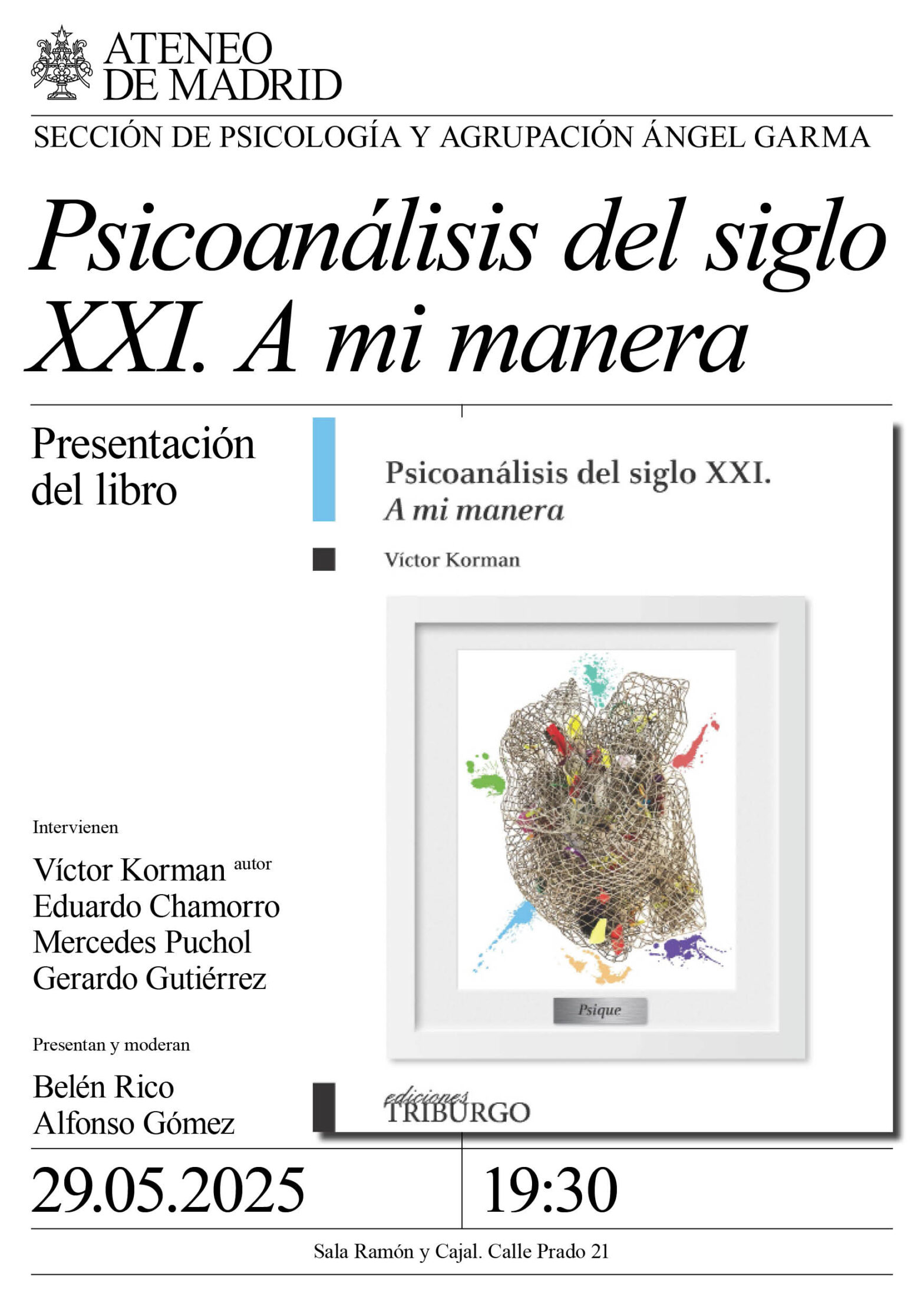 Sección de Psicología y Agrupación Ángel Garma. Intervienen: Víctor Korman, Eduardo Chamorro, Mercedes Puchol y Gerardo Gutiérrez. Presentan y moderan: Alfonso Gómez y Belén Rico. Sala Ramón y Cajal. 19:30h.