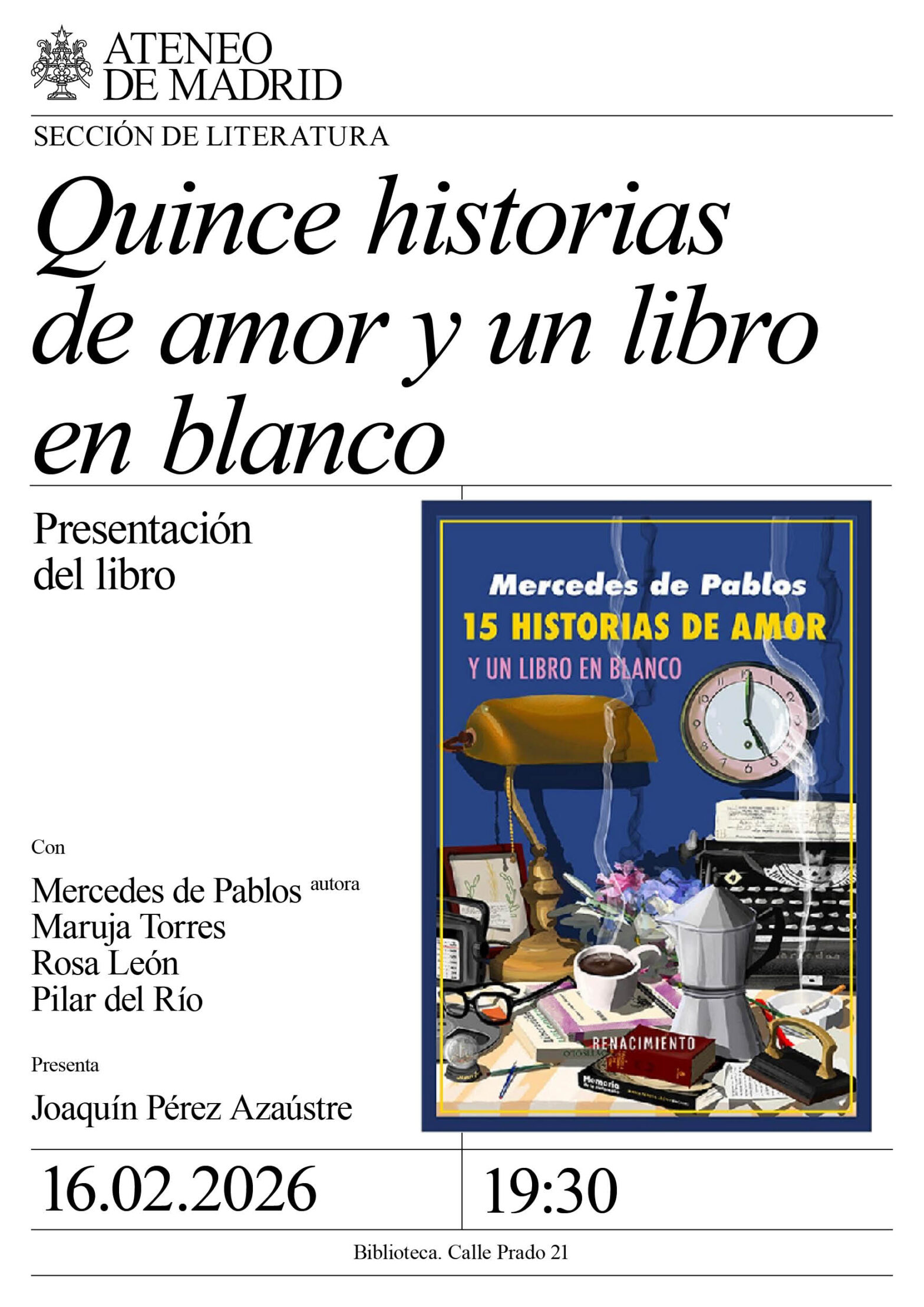 Sección de Literatura. Con: Mercedes de Pablos, autora; Maruja Torres, Rosa León y Pilar del Río, viuda de Saramago. Presenta: Joaquín Pérez Azaústre. Biblioteca. 19:30h.