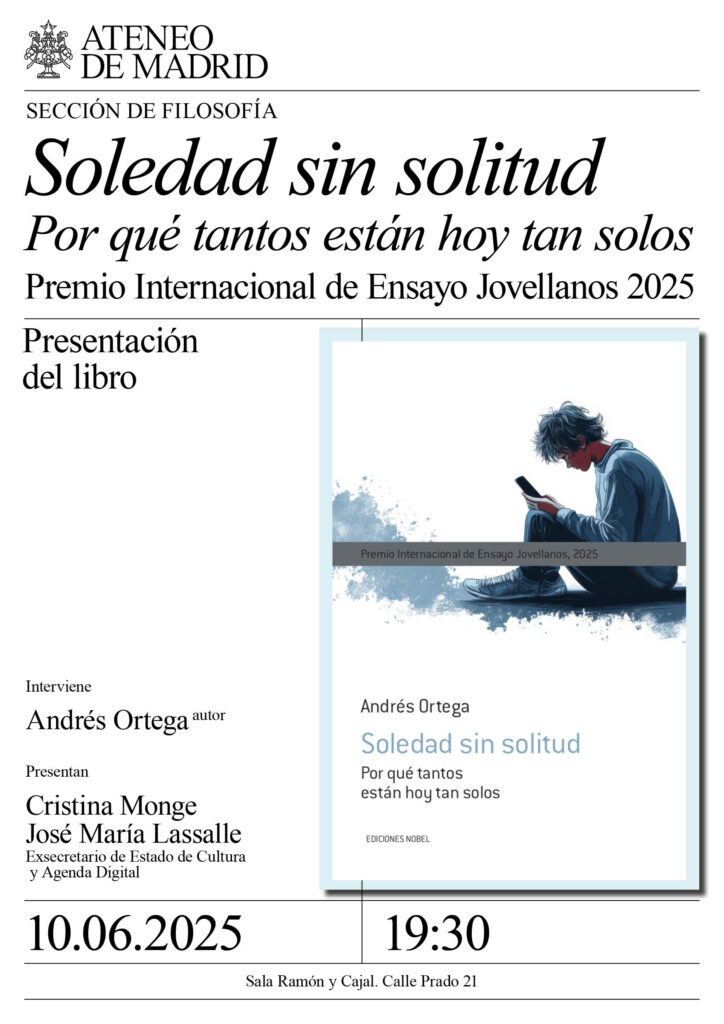 Sección de Filosofía. Interviene Andrés Ortega, autor. Presentan: Cristina Monge, profesora de Ciencia Política y José María Lassalle, profesor de Filosofía del Derecho en Icade y exsecretario de Estado de Cultura y Agenda Digital. Sala Ramón y Cajal. 19:30h.