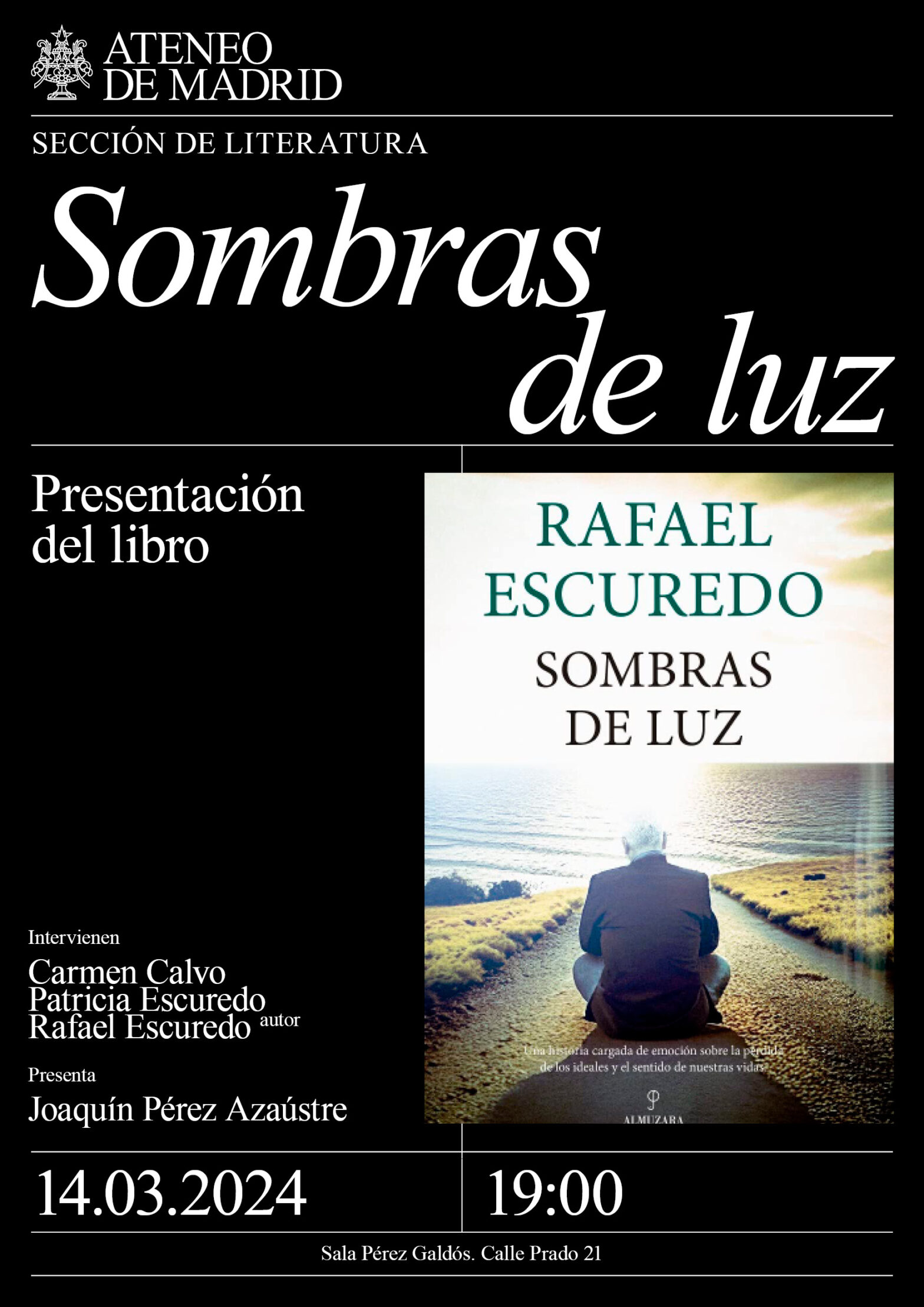 Sección de Literatura. Intervienen: Carmen Calvo. Patricia Escuredo y Rafael Escuredo, autor. Presenta: Joaquín Pérez Azaústre. Sala Pérez Galdós. 19:00h.