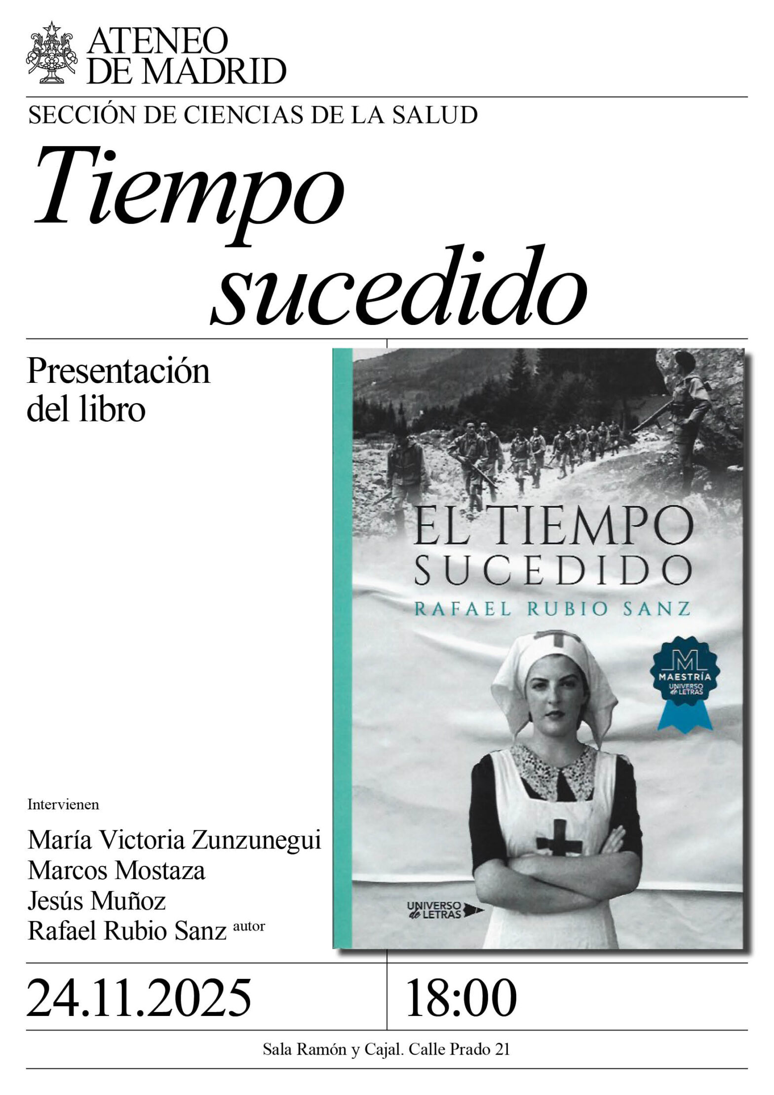 Intervienen: María Victoria Zunzunegui, epidemióloga; Marcos Mostaza, periodista; Jesús Muñoz; y Rafael Rubio Sanz, autor y cardiólogo jubilado. Sala Ramón y Cajal. 18:00h.