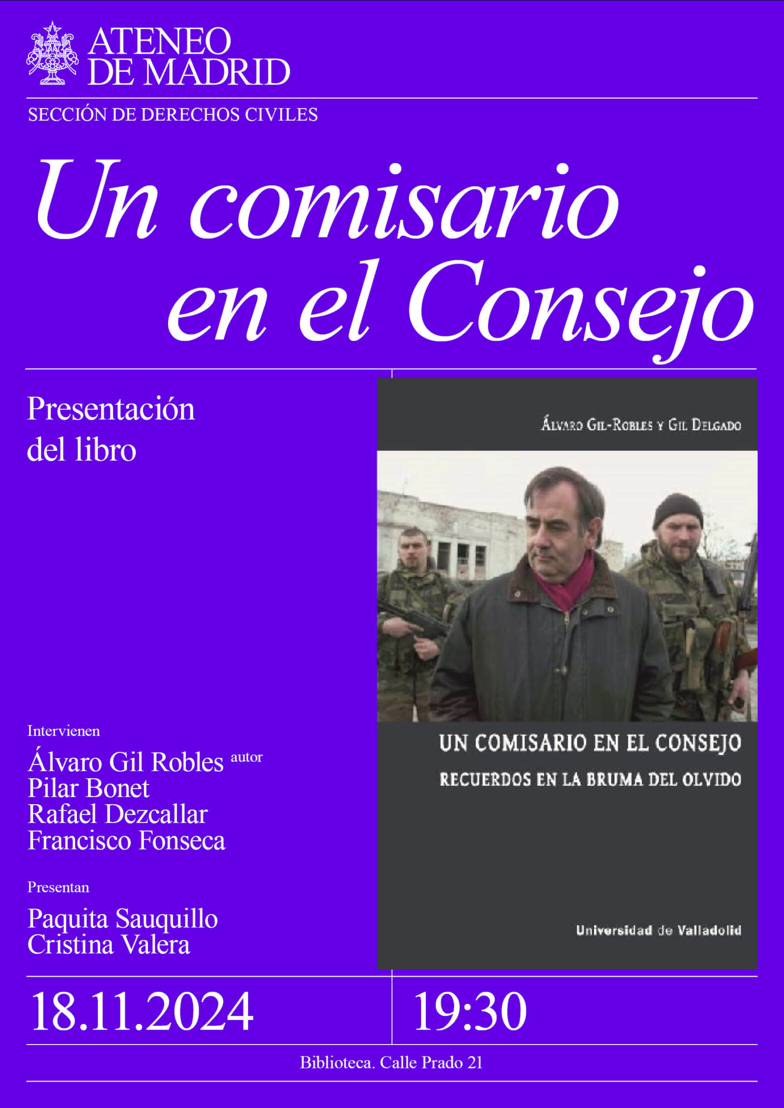 Sección de Derechos Civiles. Intervienen: Álvaro Gil Robles, autor; Pilar Bonet, Rafael Dezcallar y Francisco Fonseca, director de IEE de la Universidad de Valladolid, editora del libro. Presentan: Paquita Sauquillo y Cristina Valera. Biblioteca. 19:30h.