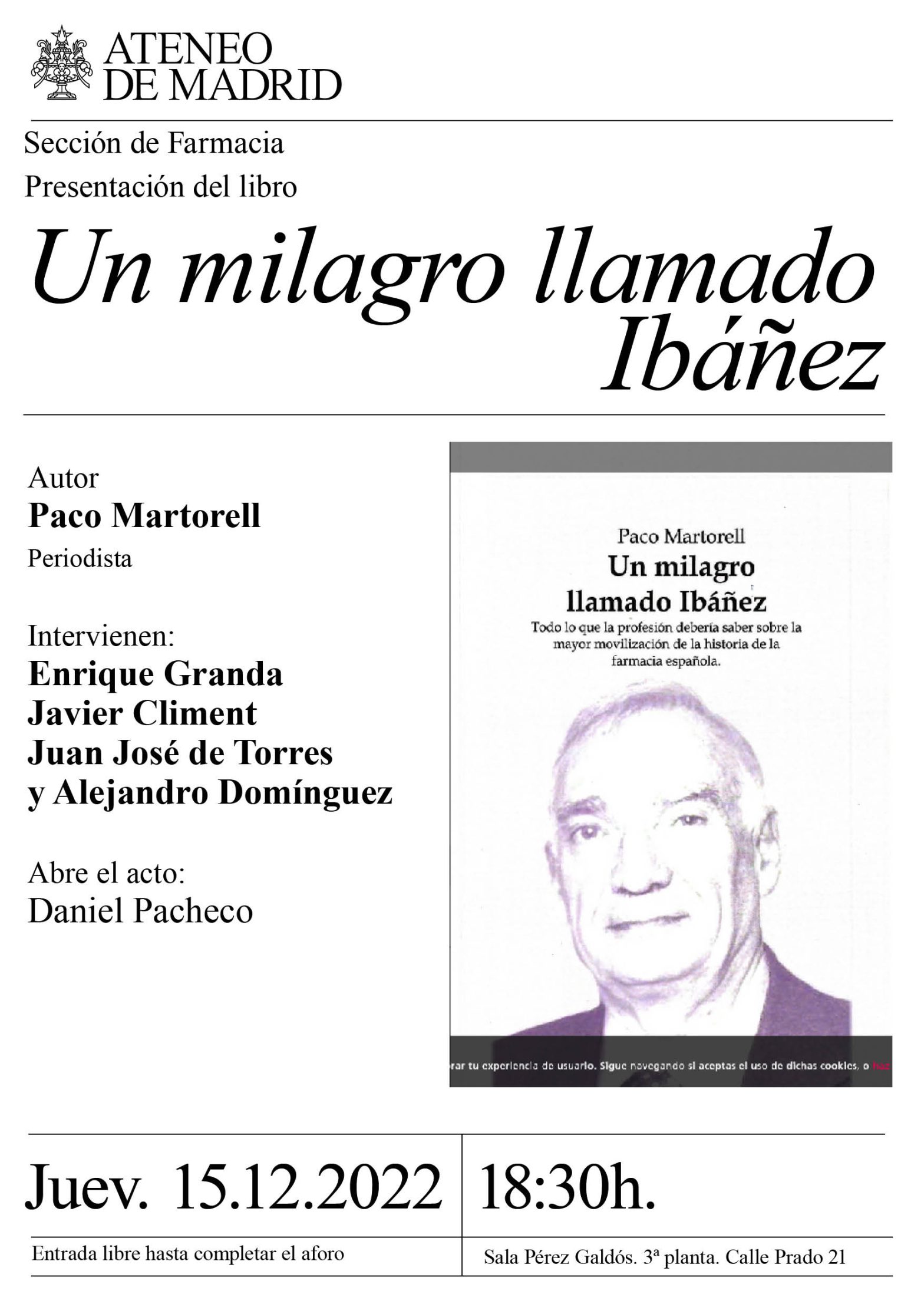 Sección de Farmacia. Presentación del libro Un milagro llamado Ibañez. Autor Paco Martorell, periodista. Intervienen Enrique Granda Javier Climent, Juan José de Torres y Alejandro Domínguez. Abre el acto Daniel Pacheco. Sala Pérez Galdós. 18:30h.