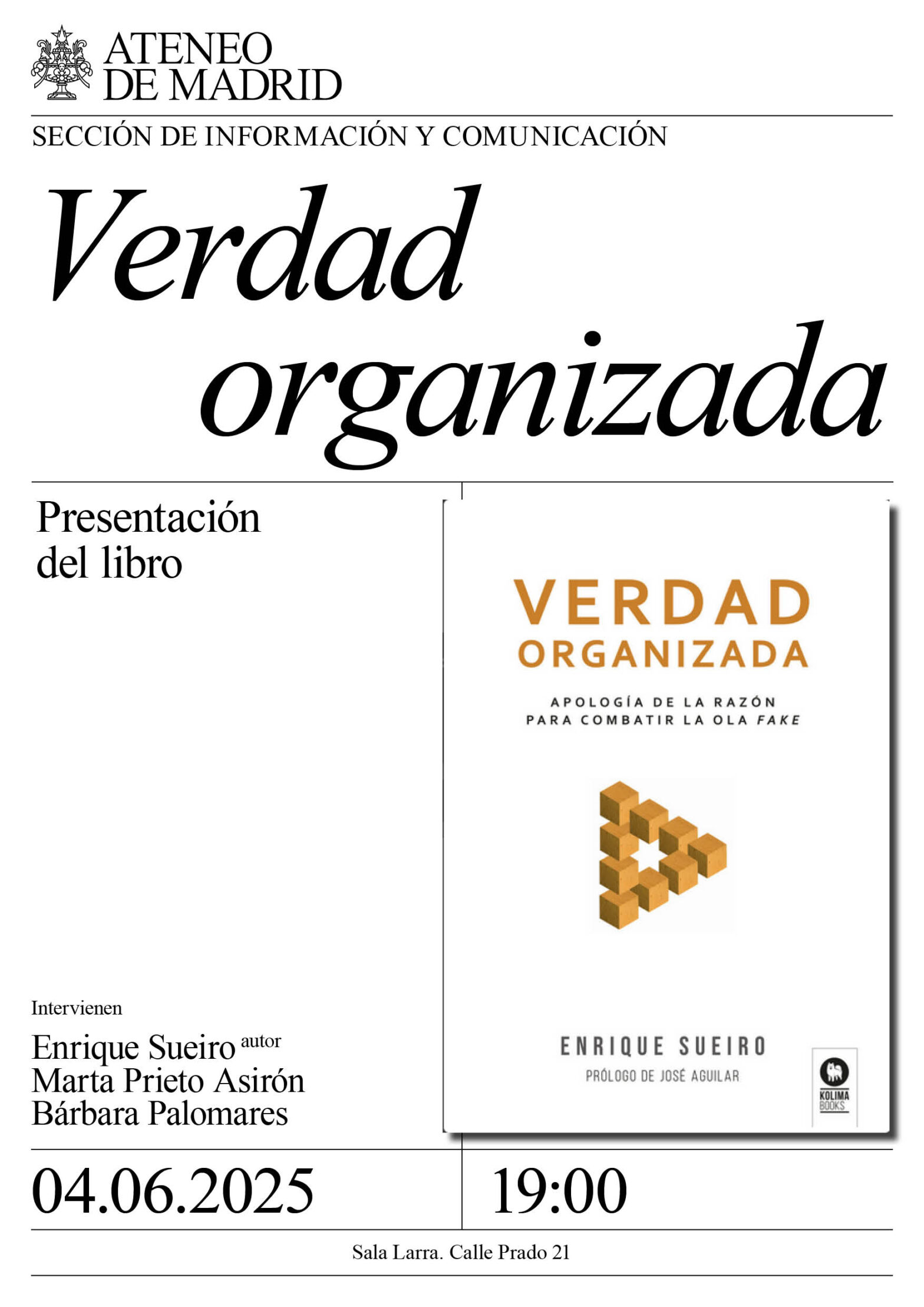 Sección de Información y Comunicación. Intervienen: Enrique Sueiro, autor, experto en comunicación directiva, escritor, profesor y conferenciante; Marta Prieto Asirón, directora de Kolima, escritora y formadora; y Barbara Palomares, historiadora. Sala Larra. 19:00h.