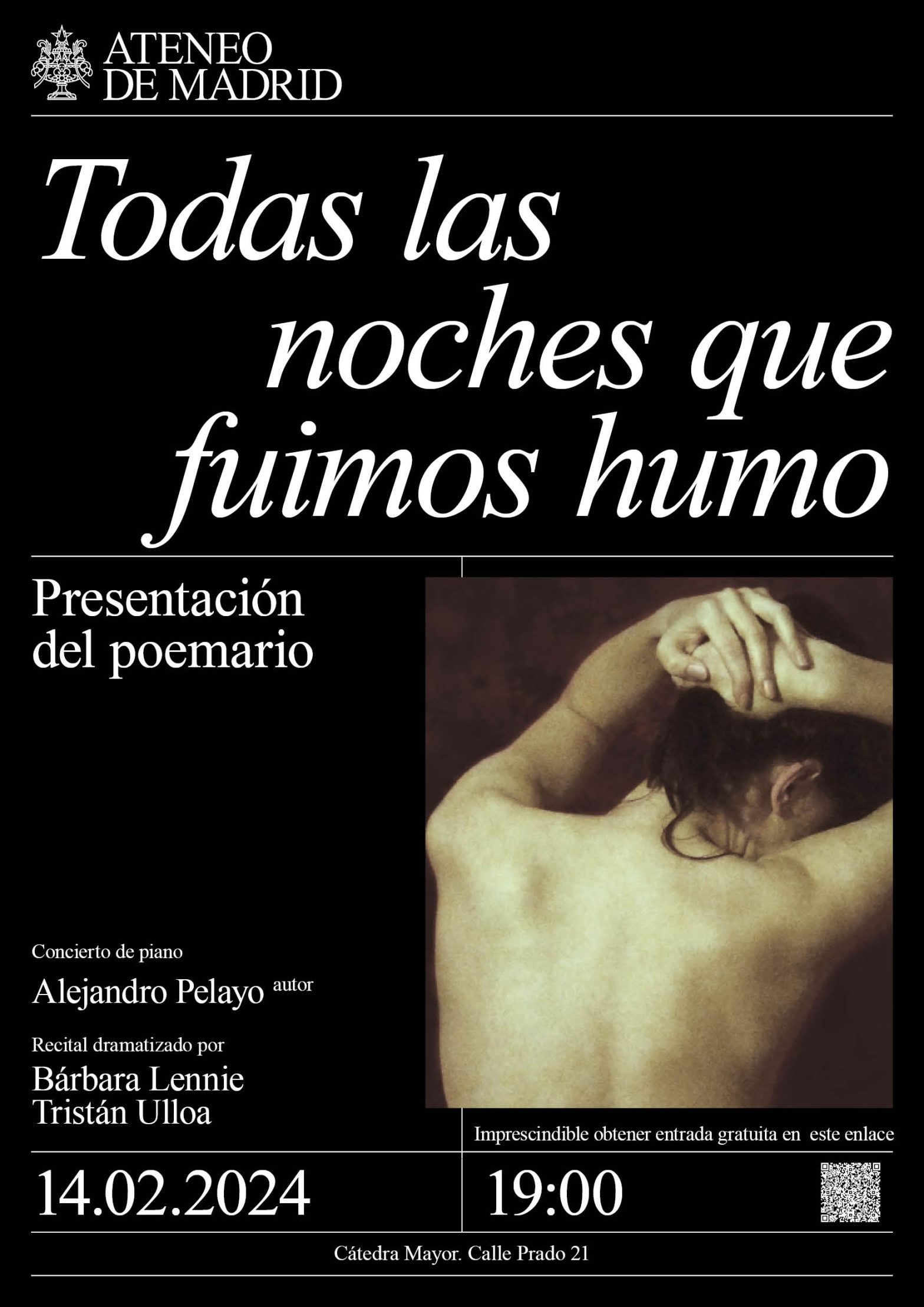 Concierto de piano Alejandro Pelayo, autor. Recital dramatizado por Bárbara Lennie y Tristán Ulloa. Cátedra Mayor. 19h.