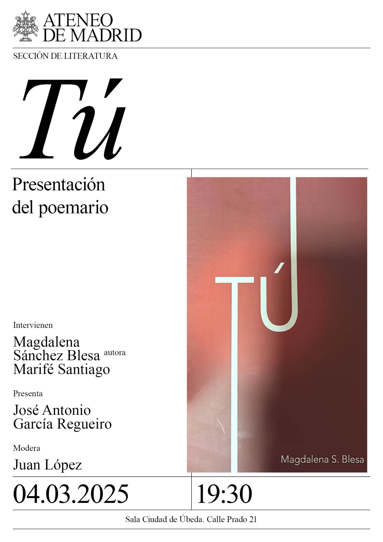 Sección de Literatura. Intervinientes: Magdalena Sánchez Blesa, autora, licenciada en Filología Hispánica y productora de cine; Marifé Santiago, filósofa, poeta, profesora de Estética y Teoría de las Artes en la Facultad de Filosofía de la Universidad Complutense de Madrid. Presenta: José Antonio García Regueiro. Modera: Juan López. Salón Ciudad de Úbeda. 19:30h.