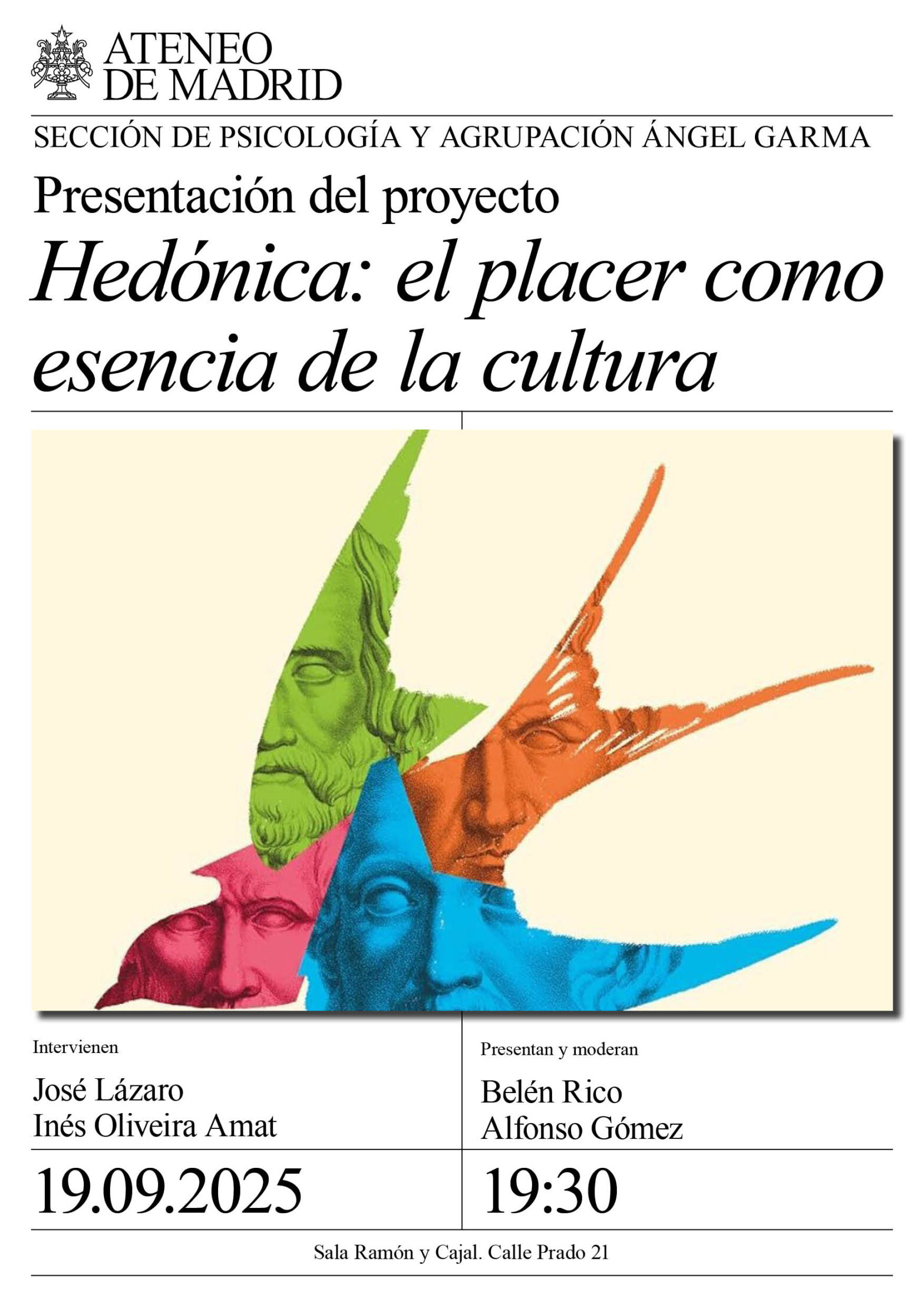 Sección de Psicología y Agrupación Ángel Garma. Intervienen: José Lázaro, director de Hedónica. Revista de Libros e Inés Oliveira Amat, médico residente en Psiquiatría en el Hospital Gregorio Marañón. Presentan y moderan: Belén Rico y Alfonso Gómez. Sala Ramón y Cajal. 19:30h.