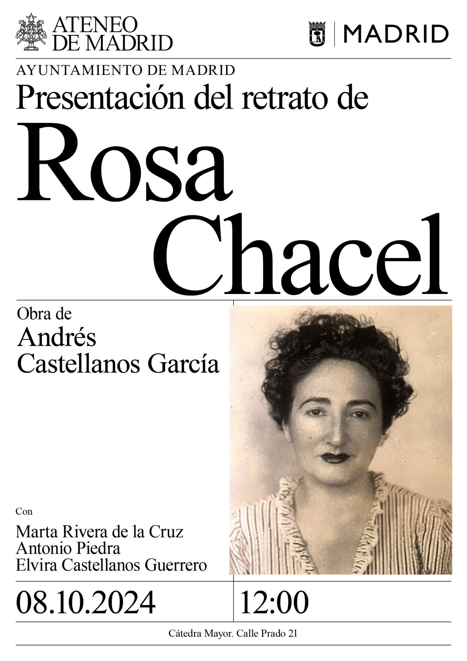 Ayuntamiento de Madrid. Con: Marta Rivera de la Cruz, tercera teniente alcalde y delegada del Área de Gobierno de Cultura, Turismo y Deporte; Antonio Piedra, en representación de Carlos Pérez Chacel; y Elvira Castellanos Guerrero, hija de Andrés Castellanos García, autor del retrato. Cátedra Mayor. 12h.
