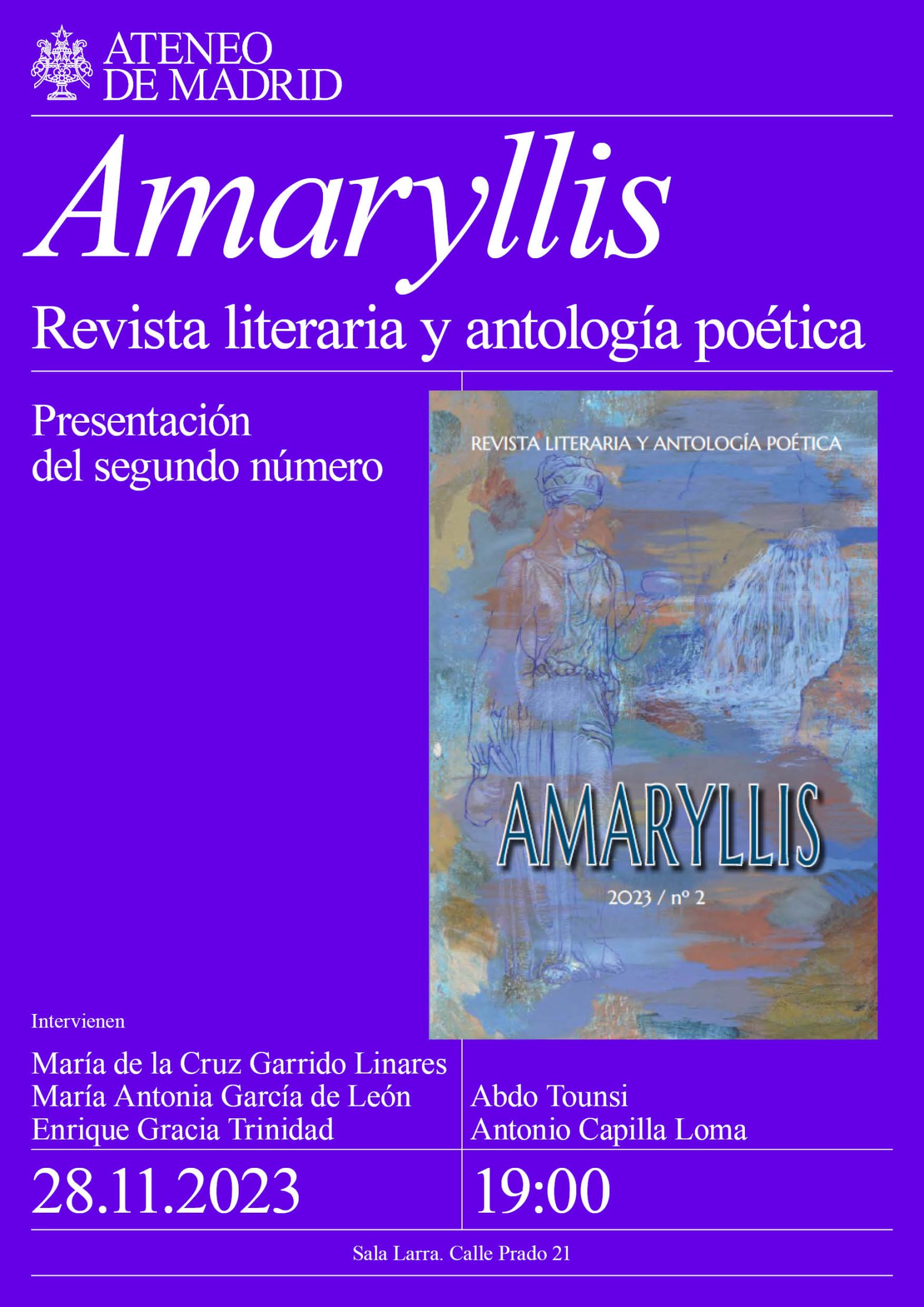 Intervienen: María de la Cruz Garrido Linares, licenciada en Filosofía y Letras, presidenta de AMEV, directora de la revista Amaryllis y académica de la Real Academia de Ciencias, Bellas Artes y Nobles Artes de Córdoba. María Antonia García de León, profesora de Sociología de la UCM, escritora y poeta. Enrique Gracia Trinidad, escritor, conferenciante, actor y divulgador cultural. Abdo Tounsi, presidente del Círculo Intercultural Hispano Árabe. Antonio Capilla Loma, licenciado en Filología Hispánica. Sala Larra. 19h.