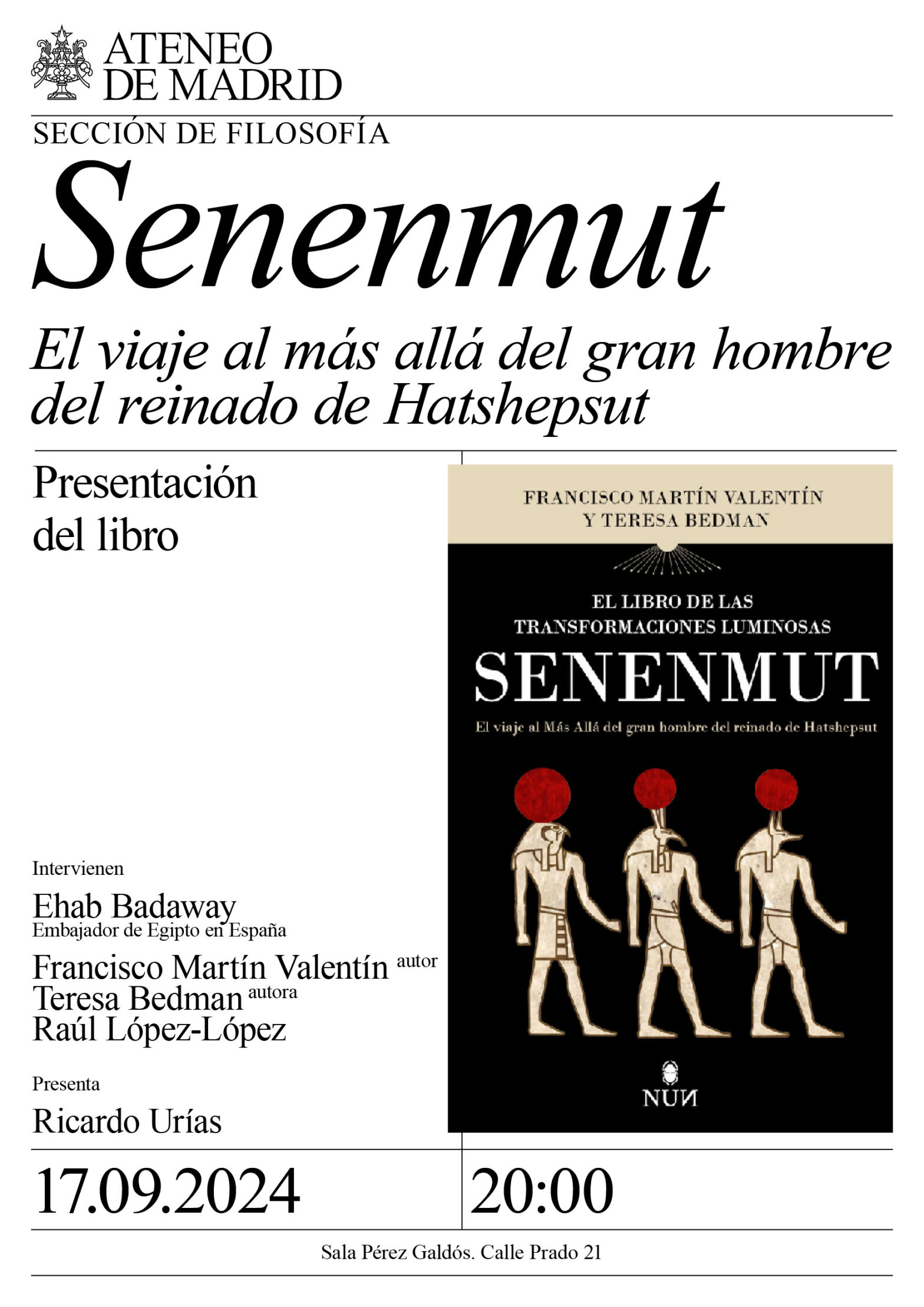 Sección de Filosofía. Intervienen: Ehab Badaway, embajador de Egipto en España; Francisco Martín Valentín, egiptólogo, director del Proyecto Visir Amen-Hotep Huy, doctor en Ciencias de la Religiones, especialidad en Religión Egipcia y profesor de Egiptología y Filología Egipcia; Teresa Bedman, profesora de Egiptología del Instituto de Estudios el Antiguo Egipto y del Master de Patrimonio Historia y Literario de la Antigüedad, directora del Instituto de Estudios del Antiguo Egipto; y Raúl López-López, editor Presenta: Ricardo Urías. Sala Pérez Galdós. 20:00h.