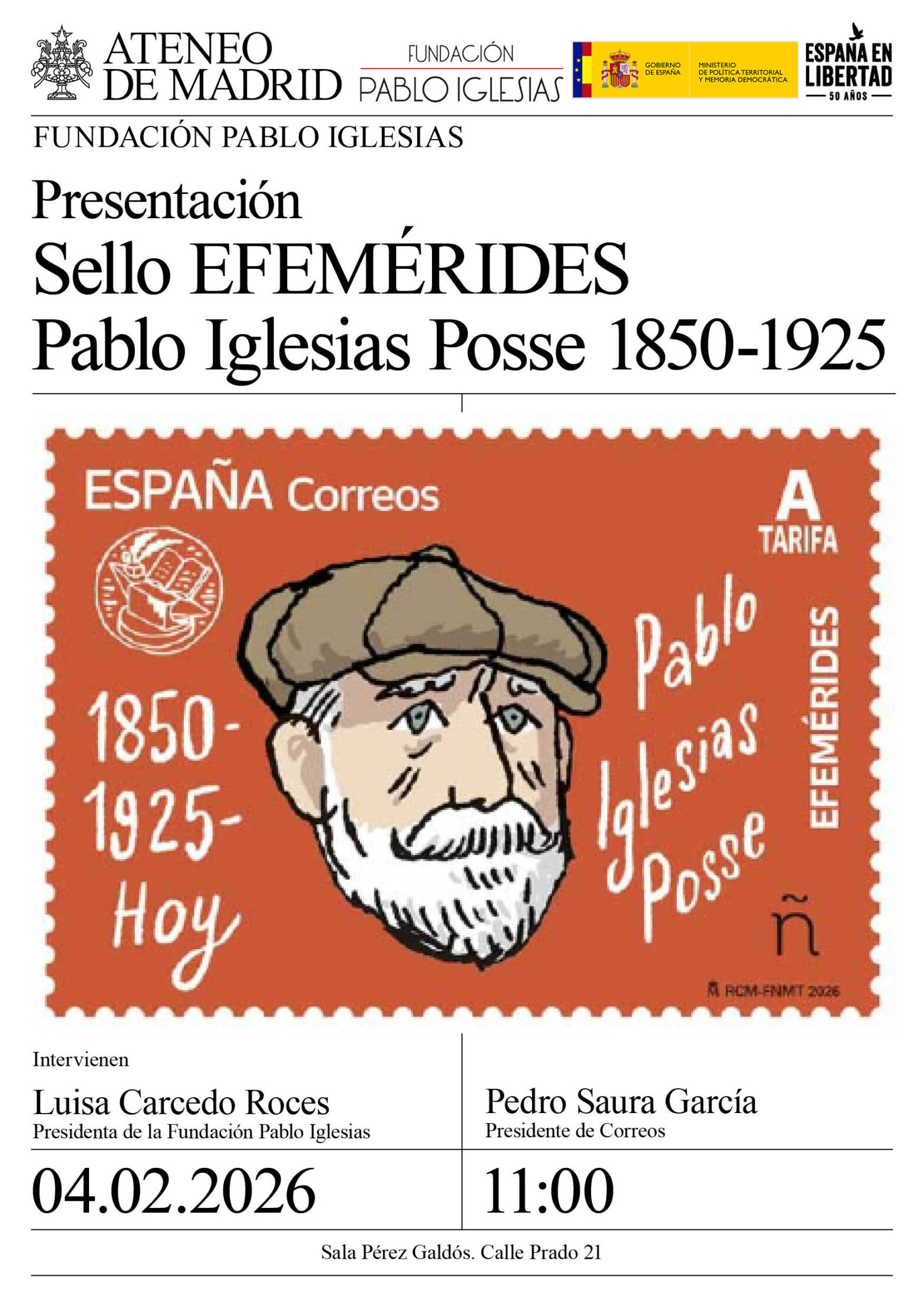 Fundación Pablo Iglesias. Intervienen: Luisa Carcedo Roces, presidenta de la Fundación Pablo Iglesias y Pedro Saura García, presidente de Correos. Sala Pérez Galdós. 11:00h.