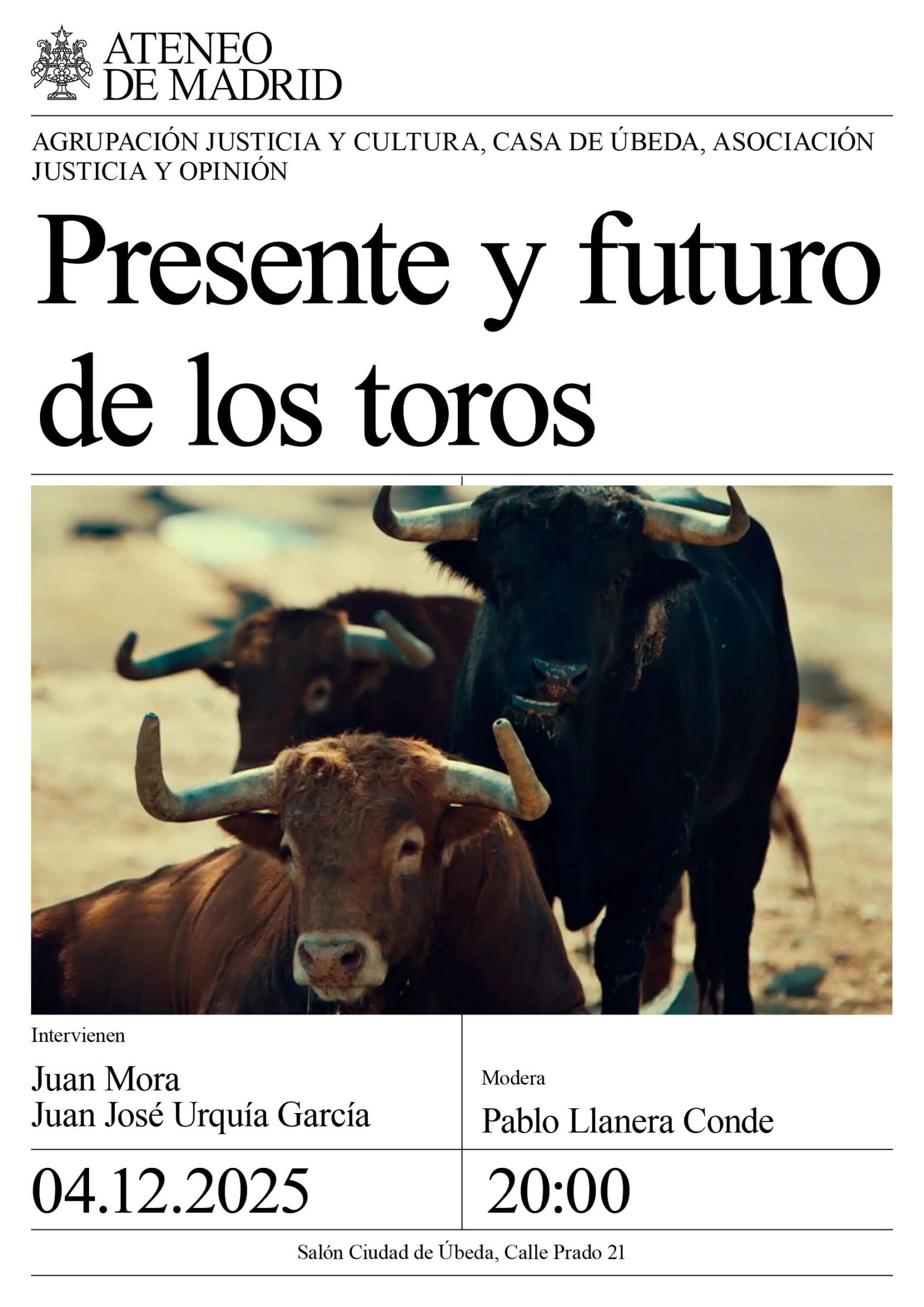 Agrupación Justicia y Cultura, Casa de Úbeda, Asociación Justicia y Opinión. Intervienen: Juan Mora, maestro del toreo; y Juan José Urquía García, presidente de la Asociación de Veterinarios de las Ventas. Modera꞉ Pablo Llanera Conde, aficionado. Salón Ciudad de Úbeda. 20:00h.