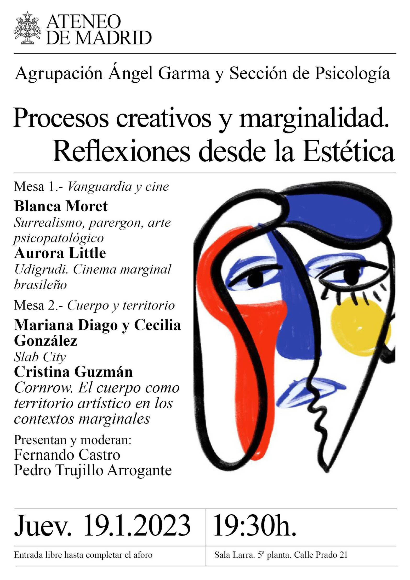 Agrupación Ángel Garma y la Sección de Psicología. Mesa 1.- Vanguardia y cine:  Blanca Moret. «Surrealismo, parergon, arte psicopatológico». Aurora Little. «Udigudri. Cinema marginal brasileño». Mesa 2. Cuerpo y territorio: Mariana Diago y Celia González. «Slab City». Cristina Guzmán. «Cornrow. El cuerpo como territorio artístico en los contextos marginales». Presentan y moderan: Fernando Castro y Pedro Trujillo Arrogane. Sala Larra. 19:30h.