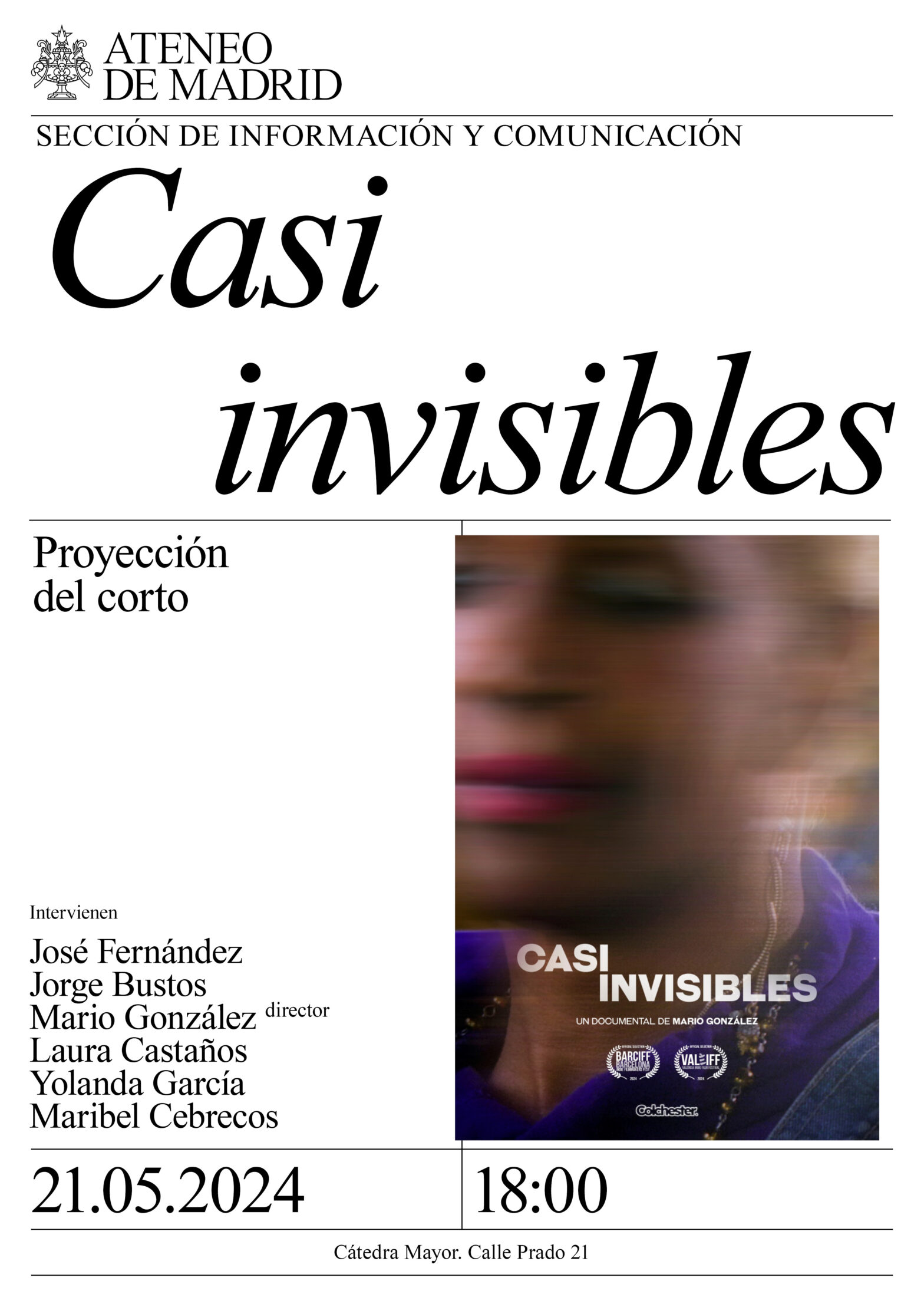 Sección de Información y Comunicación. Intervienen: José Fernández, delegado del Área de Gobierno de Políticas Sociales, Familia e Igualdad del Ayuntamiento de Madrid; Mario González, director del corto; Jorge Bustos, periodista y escritor; Laura Castaños, directora general de Inclusión Social del Ayuntamiento de Madrid; Yolanda García, jefa de Departamento de Prevención del Sinhogarismo del Ayuntamiento de Madrid; y Maribel Cebrecos, directora del Centro de Acogida San Isidro (CASI). Cátedra Mayor. 18:00h.