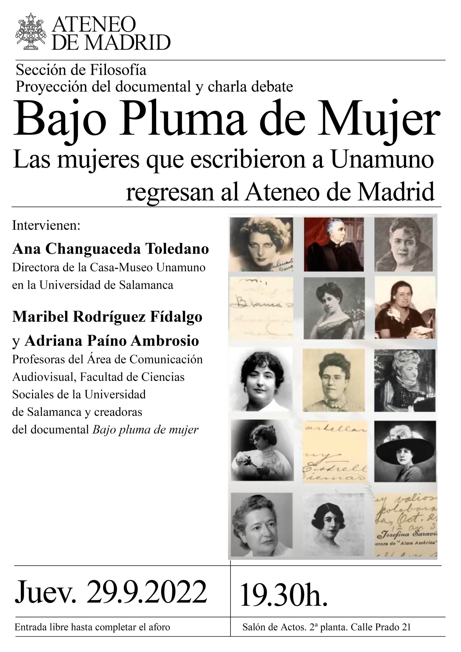 Proyección del documental y charla debate. Bajo Pluma de Mujer. Las mujeres que escribieron a Unamuno regresan al Ateneo de Madrid