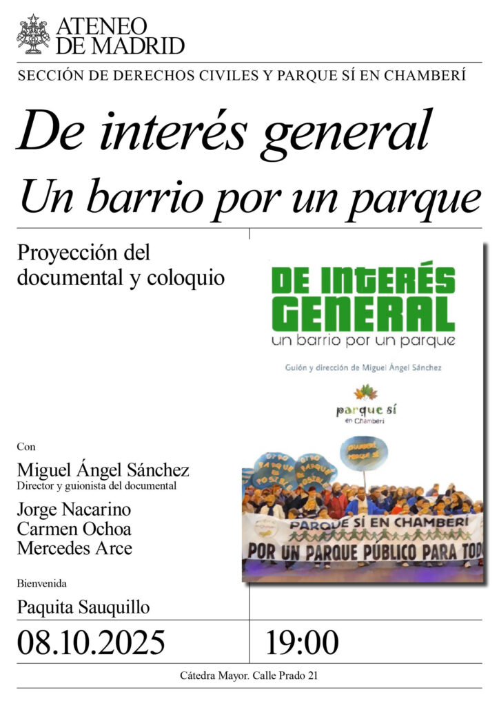 Sección de Derechos Civiles y Parque Sí en Chamberí. Con: Miguel Ángel Sánchez, director y guionista del documental; Jorge Nacarino, presidente de la FRAVM; Carmen Ochoa; y Mercedes Arce, representantes de la Asociación Parque SÍ en Chamberí. Bienvenida: Paquita Sauquillo. Cátedra Mayor. 19:00h.