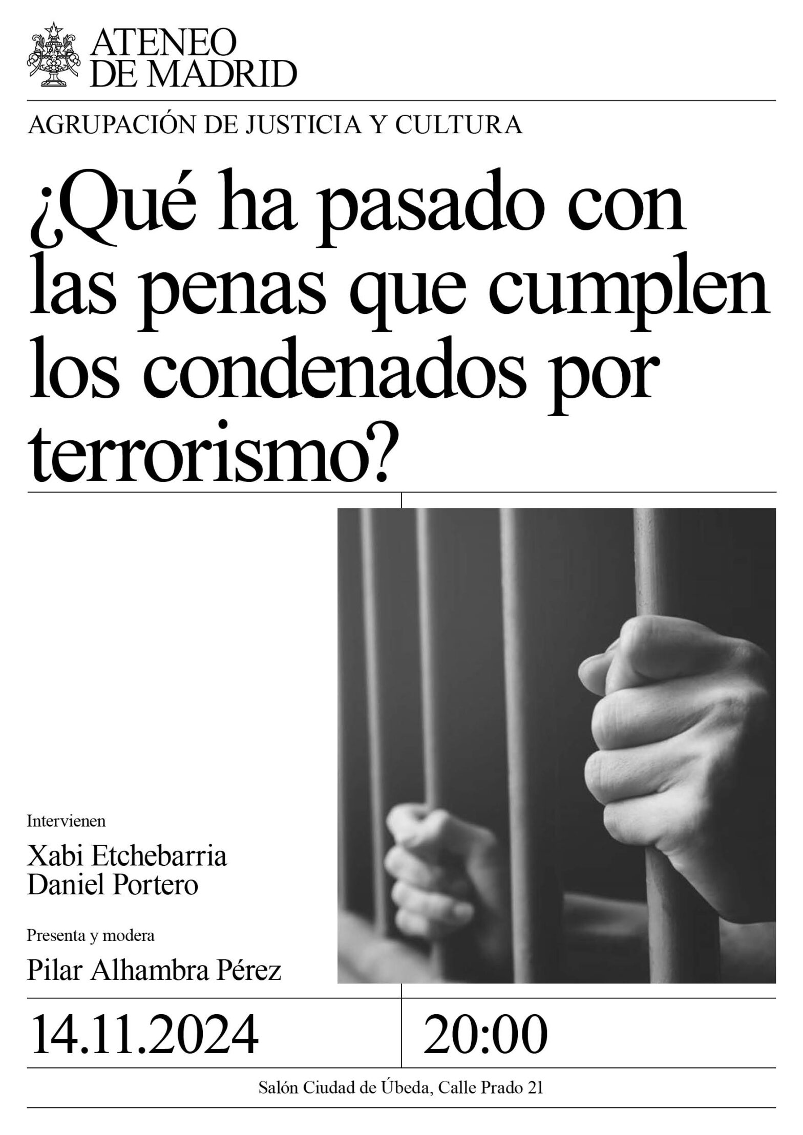 Agrupación de Justicia y Cultura. Intervendrán: Xabi Etchebarria, abogado y profesor universitario; Daniel Portero, presidente de la Asociación Dignidad y Justicia. Presenta y modera: Pilar Alhambra Pérez, magistrada, miembro de la Junta Directiva de la Asociación Justicia y Opinión. Salón Ciudad de Úbeda. 20:00h.