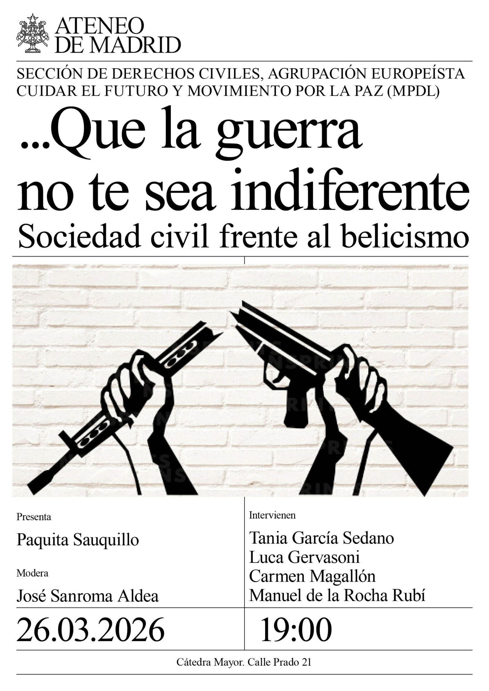 Sección de Derechos Civiles, Agrupación Europeísta Cuidar el Futuro y Movimiento por la Paz (MPDL). Presenta: Paquita Sauquillo. Modera: José Sanroma Aldea. Intervienen: Tania García Sedano, Federación de Derechos Humanos; Luca Gervasoni, coordinadora de ONGs para el desarrollo; Carmen Magallón, Asociación Española de Investigación para la Paz; y Manuel de la Rocha Rubí, Movimiento por la Paz (MPDL). Cátedra Mayor. 19:00h.
