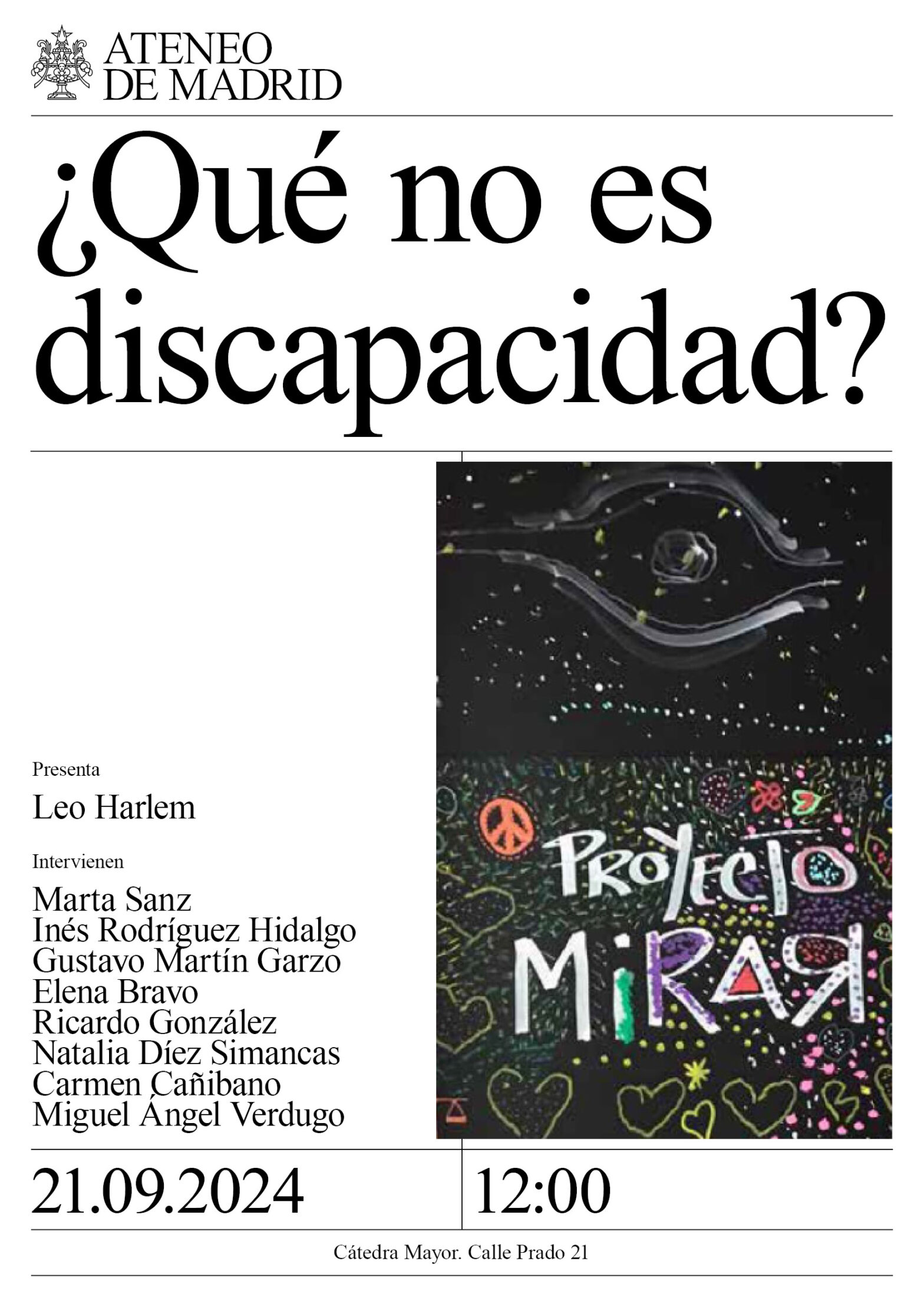 Presenta: Leo Harlem, humorista y mentor del Proyecto MIRAR. Intervienen: Marta Sanz, vicepresidenta primera del Ateneo; Inés Rodríguez Hidalgo, madre de Arturo y astrofísica; Gustavo Martín Garzo, escritor; Elena Bravo, creadora participante Proyecto MIRAR; Ricardo González, fotógrafo; Natalia Diez Simancas, responsable Acción Social Castilla y León de CaixaBank; Carmen Cañibano, artista visual; y Miguel Ángel Verdugo, catedrático de Psicología de la Discapacidad de la Universidad de Salamanca. Cátedra Mayor. 12:00h Vídeo del evento (ver)