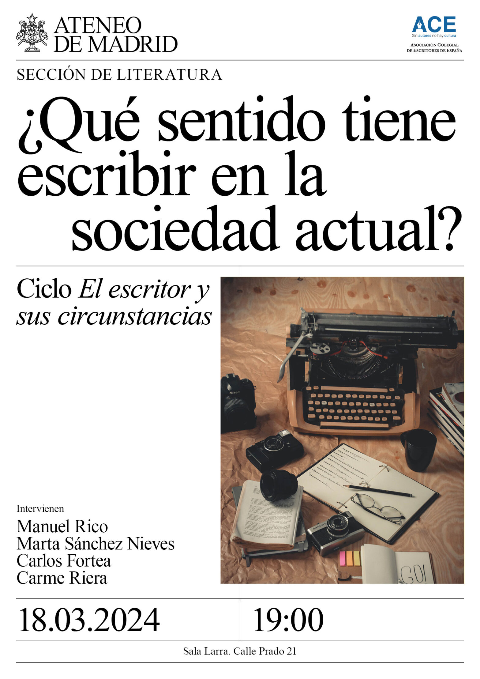 Sección de Literatura. Intervienen: Manuel Rico, Marta Sánchez Nieves, Carlos Fortea, Carme Riera. Sala Larra. 19:00h.