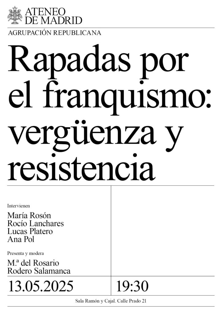 Agrupación Republicana. Intervienen: María Rosón, Rocío Lanchares, Lucas Platero y Ana Pol. Presenta y modera M.ª del Rosario Rodero Salamanca. Sala Ramón y Cajal. 19:30h.