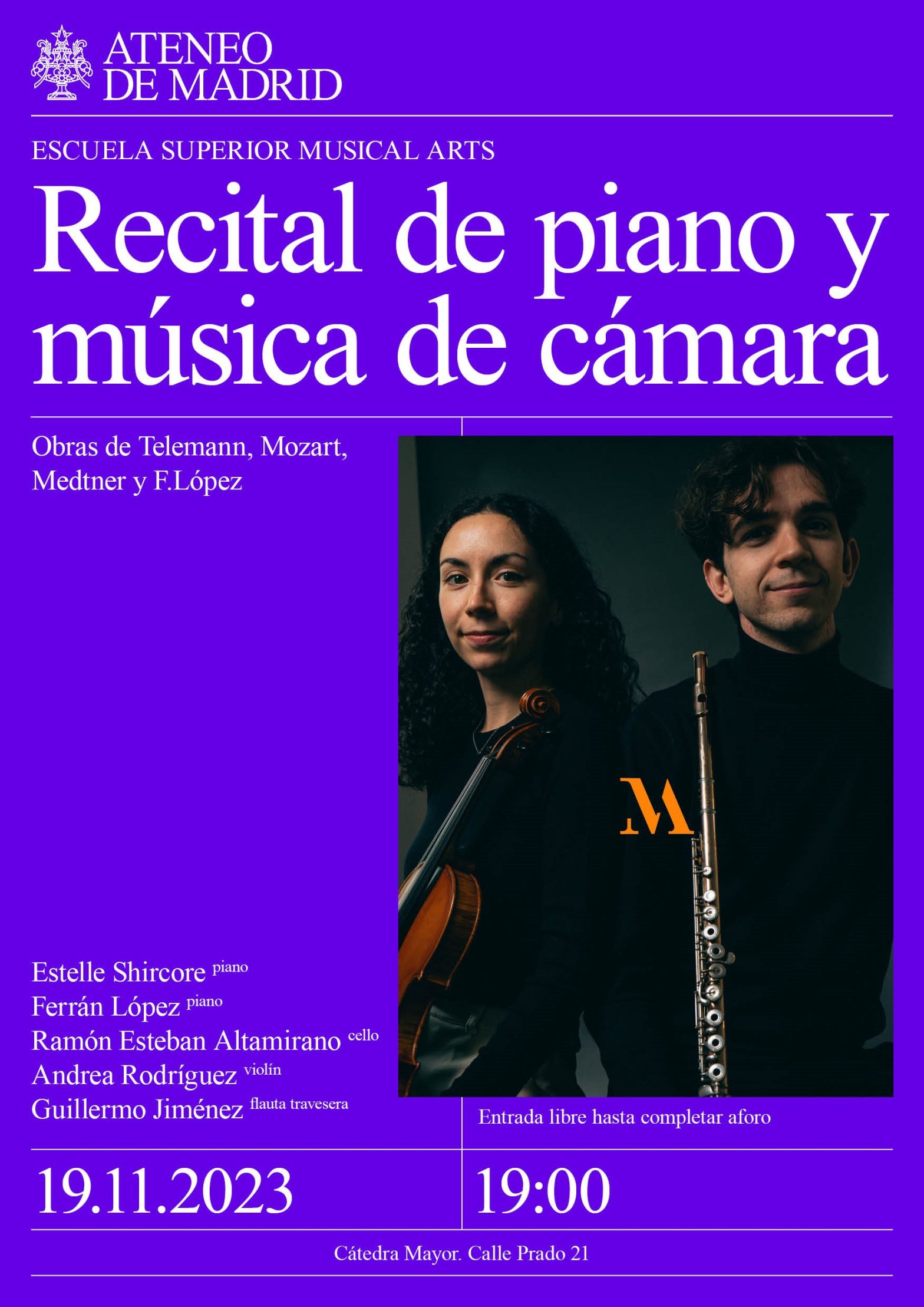 Escuela Superior Musical Arts. Obras de Telemann, Mozart, Medtner y F.López.Estelle Shircore piano Ferrán López piano Ramón Esteban Altamirano cello Andrea Rodríguez violín Guillermo Jiménez flauta traveseraCátedra Mayor. 19h.