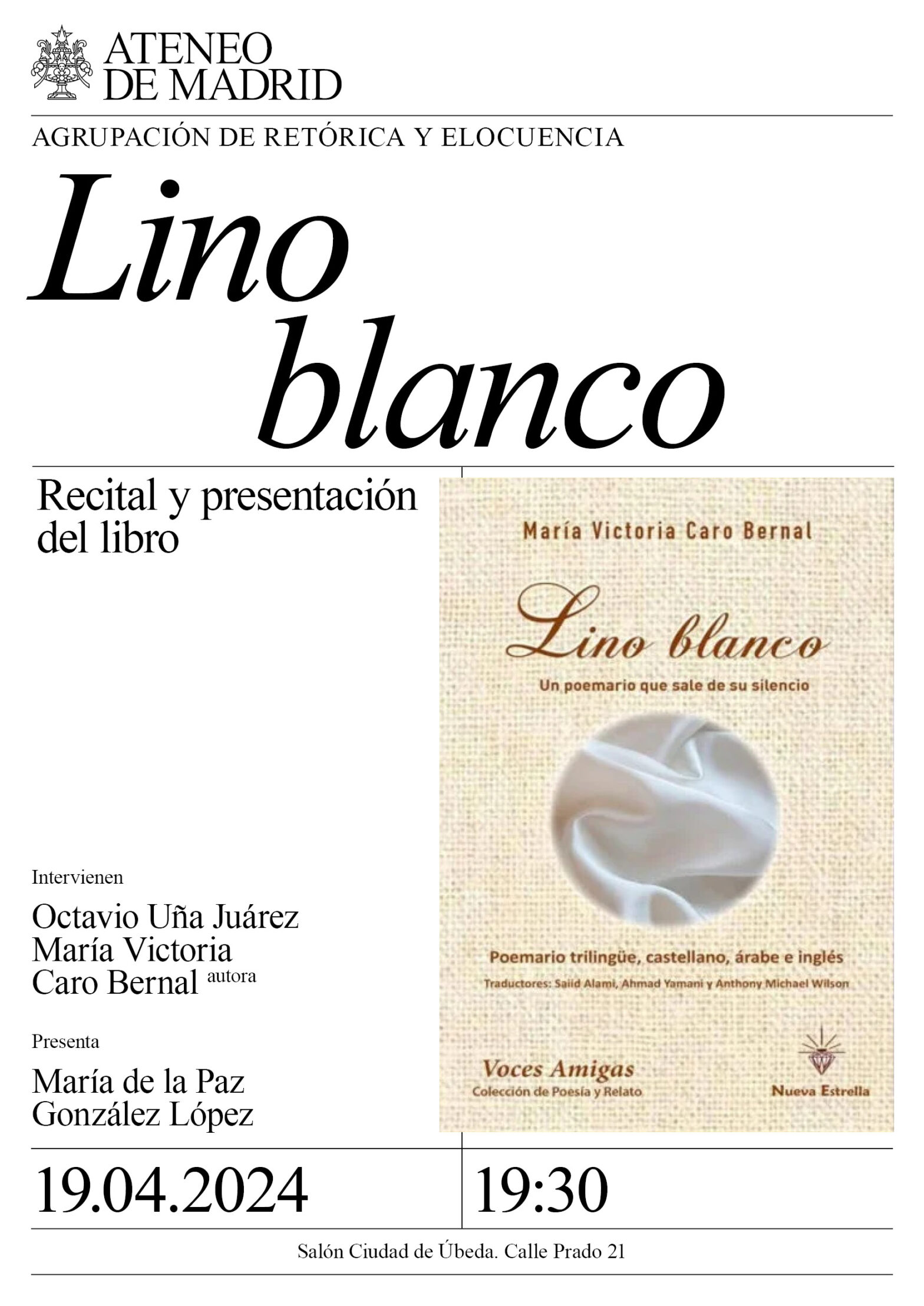 Agrupación Ateneísta Juan Negrín. Intervienen: Octavio Uña Juárez, poeta, catedrático de Filosofía y de Sociología; Victoria Caro Bernal, poeta y autora. Presenta: María de la Paz González López. Salón Ciudad de Úbeda. 19:30h.