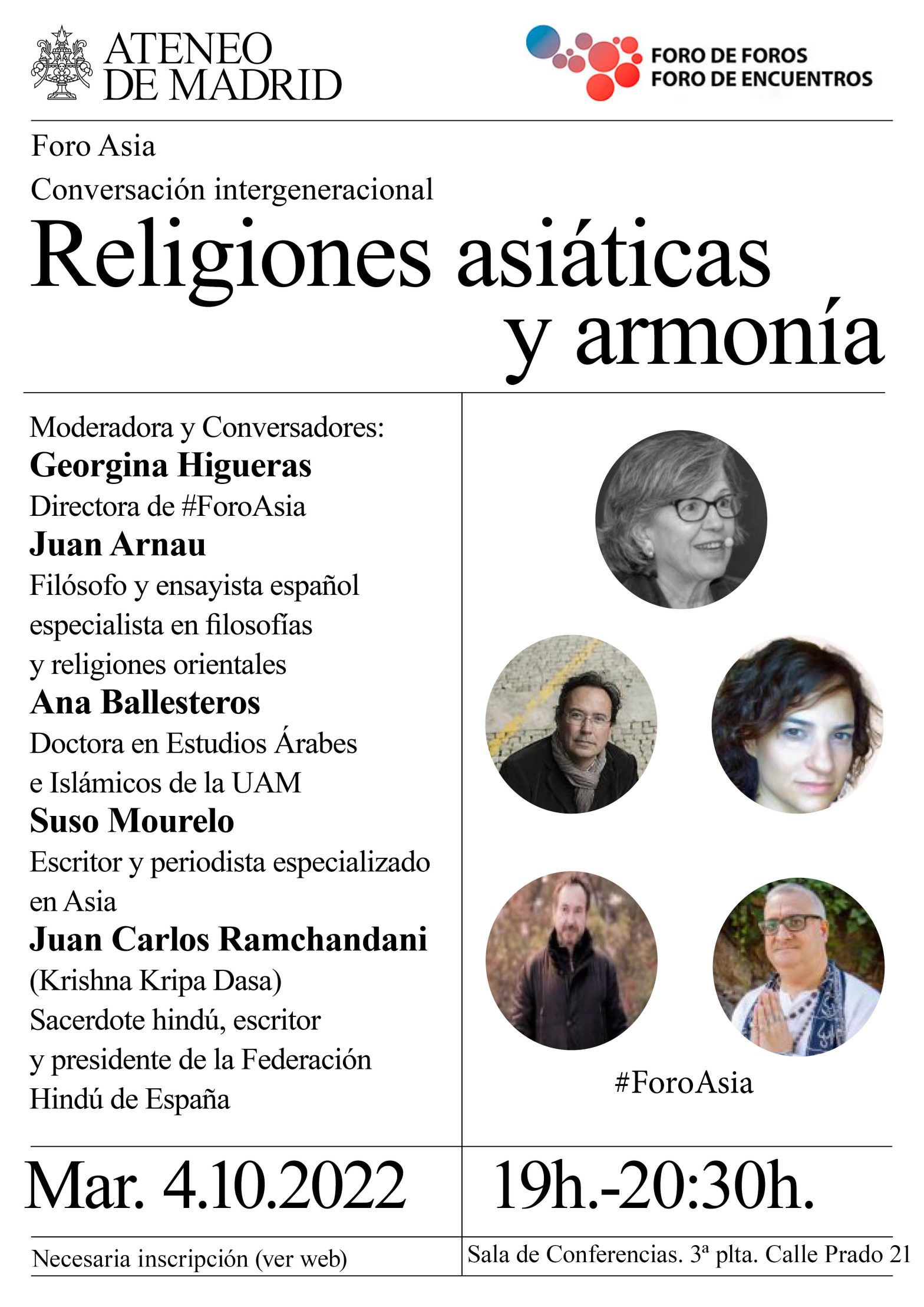 Conversación intergeneracional. #ForoAsia. Budismo, hinduismo, Islam asiático y sintoísmo tratan de acercar el hombre a la naturaleza y alientan la búsqueda del equilibrio personal en un continente que se debate entre sus valores tradicionales y el orden internacional liberal, mientras su filosofía y su espiritualidad ganan cada día más adeptos en Occidente. Moderadora y Conversadores: Georgina Higueras, directora de #ForoAsia.; Juan Arnau, filósofo y ensayista español especialista en filosofías y religiones orientales; Ana Ballesteros, doctora en Estudios Árabes e Islámicos – UAM; Suso Mourelo, escritor y periodista especializado en Asia, Juan Carlos Ramchandani (Krishna Kripa Dasa), sacerdote hindú, escritor y presidente de la Federación Hindú de España. (+info)