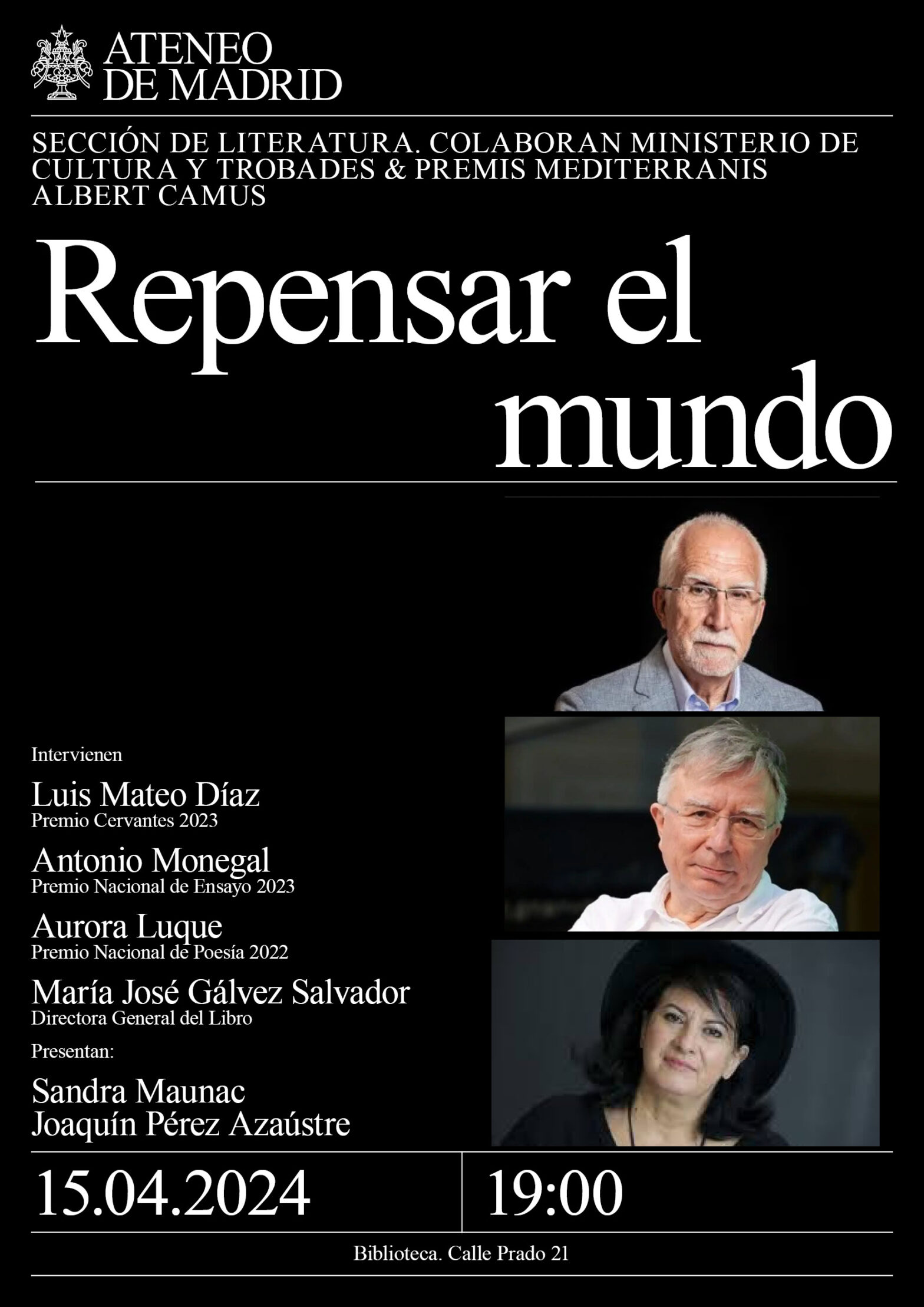 Sección de Literatura. Colaboran: Ministerio de Cultura y Trobades & Premis Mediterranis Albert Camus. Intervienen: Luis Mateo Díaz (Premio Cervantes 2023), Antonio Monegal (Premio Nacional de Ensayo 2023), Aurora Luque (Premio Nacional de Poesía 2022), María José Gálvez Salvador, directora general del Libro. Presentan: Sandra Maunac y Joaquín Pérez Azaústre. Biblioteca. 19:00h.
