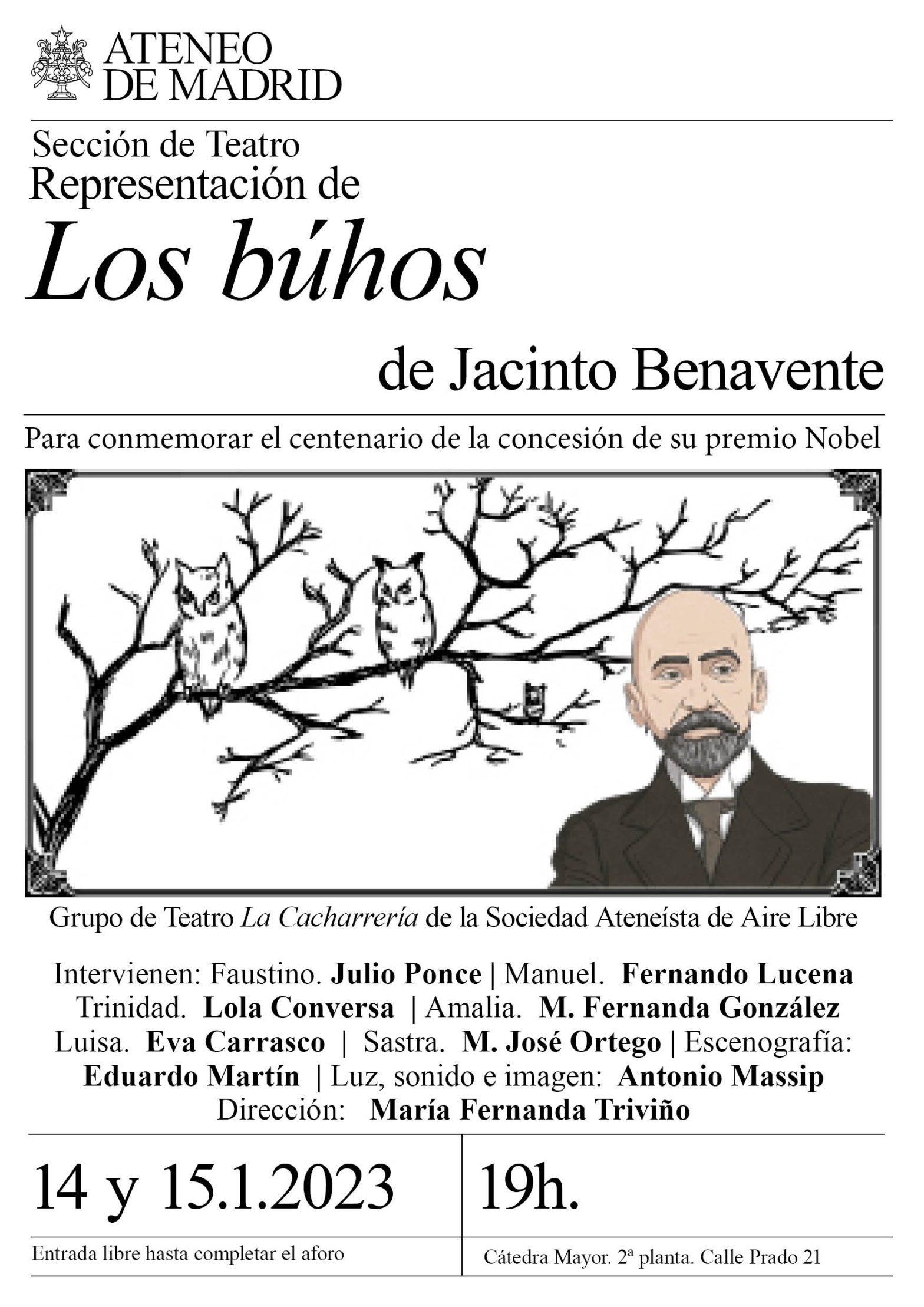 Sección de Teatro. Homenaje a los 100 años de la concesión de premio Nobel a D. Jacinto Benavente. Crupo de Teatro La Cacharrería de la Sociedad Ateneísta de Aire Libre. Reparto por orden de aparición: Faustino: Julio Ponce, Manuel: Fernando Lucena, Trinidad: Lola Conversa, Amalia: Maria Fernanda González, Luisa: Eva Carrasco,Sastra: M. José Ortego. Escenografía: Eduardo Martín. Luces, sonido e imagen: Antonio Massip. Dirección: María Fernanda Triviño. Cátedra Mayor. 19h.