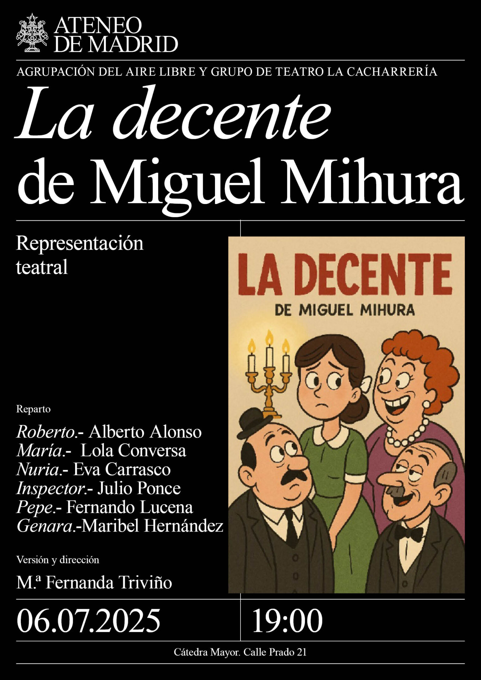 Agrupación del Aire Libre y Grupo de Teatro La Cacharrería. Reparto: Roberto.- Alberto Alonso; María.- Lola Conversa; Nuria.- Eva Carrasco; Inspector.- Julio Ponce; Pepe.- Fernando Lucena; Genara.-Maribel Hernández. Versión y dirección M.ª Fernanda Triviño. Cátedra Mayor. 19:00h.