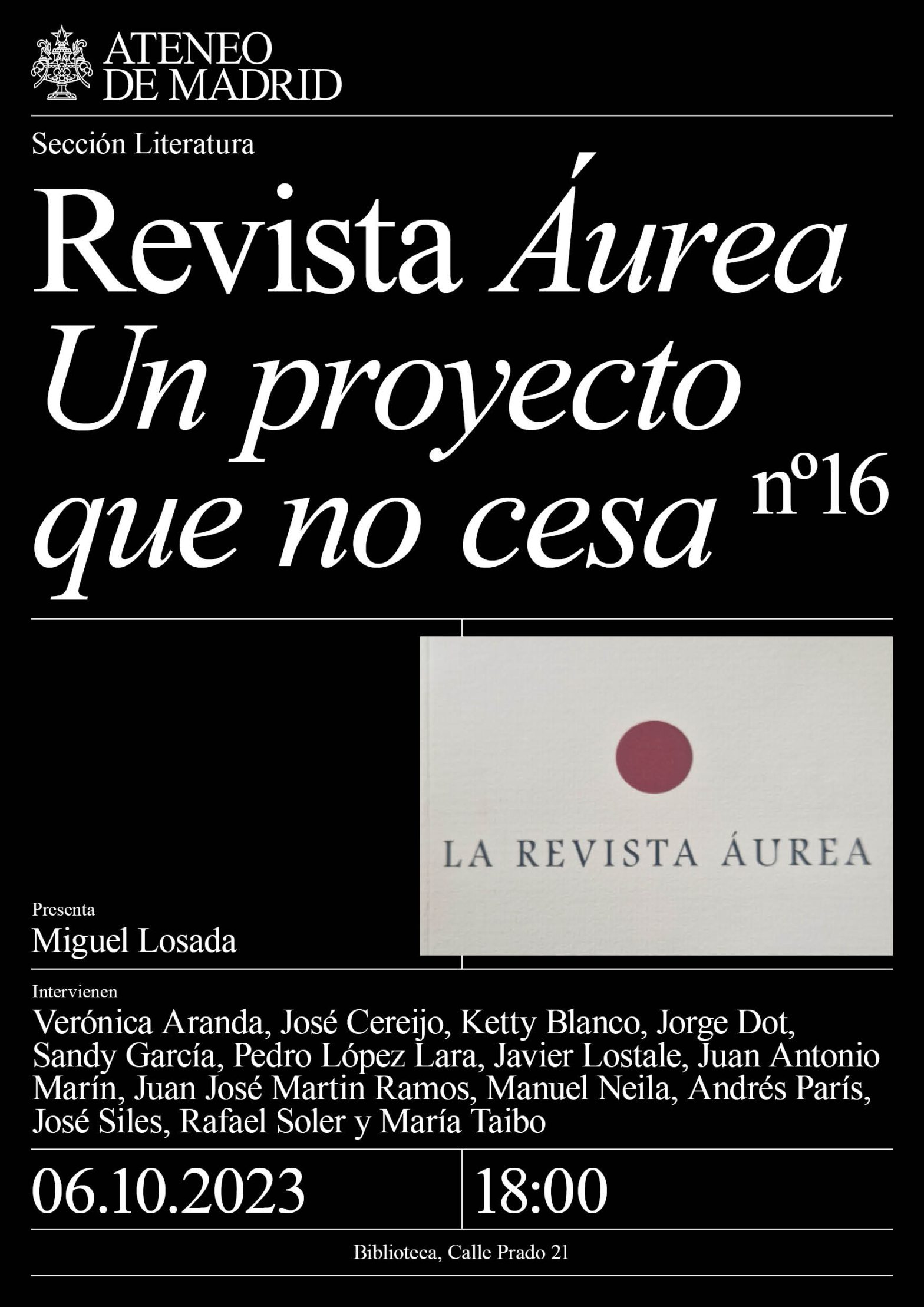 Sección de Literatura. Participan: Verónica Aranda, Ketty Blanco, José Cereijo, Jorge Dot, Sandy García, Pedro López Lara, Javier Lostale, Juan Antonio Marín, Juan José Martin Ramos, Manuel Neila, Andrés París, José Siles, Rafael Soler, María Taibo. Presenta: Miguel Losada. Biblioteca. 18h.