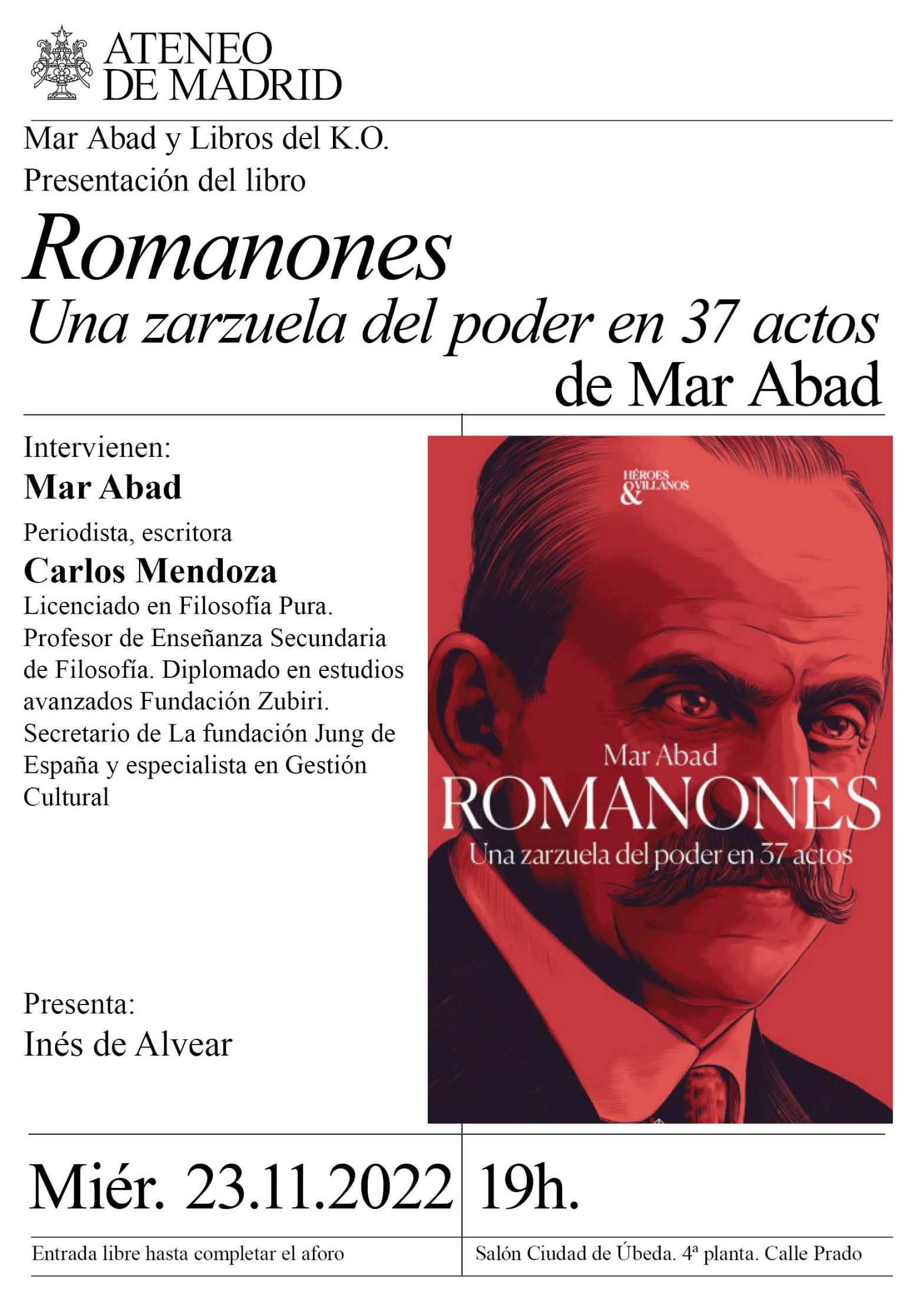 Mar Abad y Libros del K.O. Romanones. Una zarzuela del poder en 37 actos. Intervienen Mar Abad periodista y escritora y Carlos Mendoza, licenciado en Filosofía Pura. Profesor de Enseñanza Secundaria de Filosofía. Diplomado en estudios avanzados Fundación Zubiri. Secretario de La fundación Jung de España y especialista en Gestión Cultural . Presenta Inés de Alvelar. Salón ciudad de Úbeda. 19 h.