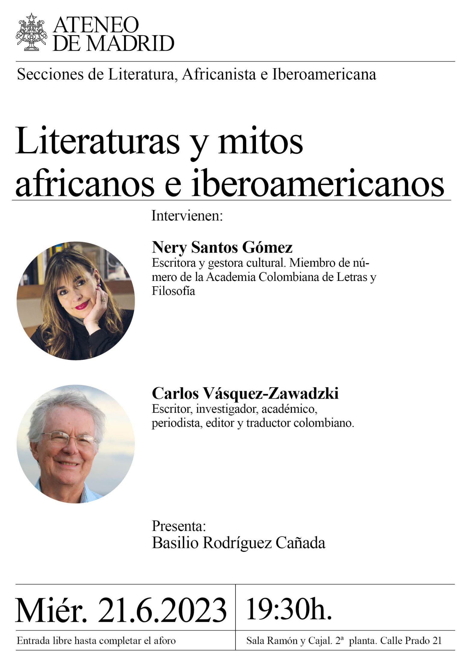 Secciones de Literatura, Africanista e Iberoamericana. Intervienen: Nery Santos Gómez, escritora y gestora cultural, venezolana, naturalizada estadounidense. Miembro de número de la Academia Colombiana de Letras y Filosofía y miembro asociado del capítulo de España de la Academia Norteamericana de Literatura Moderna Internacional del Estado de New Jersey; Carlos Vásquez-Zawadzki, escritor, investigador, académico, periodista, editor y traductor colombiano. En la actualidad es presidente del PEN Colombia de Escritores. Presenta: Basilio Rodríguez Cañada. Sala Ramón y Cajal. 19:30h.
