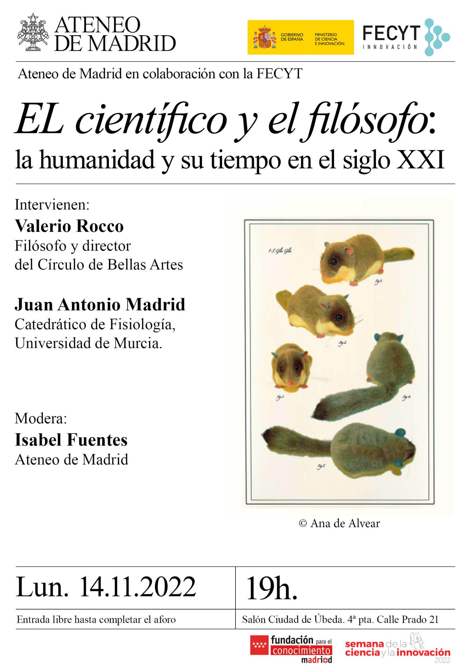 Ateneo Científico, Literario y Artístico de Madrid en colaboración con la FECYT. El físico y el filosofo: la humanidad y su tiempo en el siglo XXI. Intervienen: Valerio Rocco, filósofo y director del Círculo de Bellas Artes. Juan Antonio Madrid, catedrático de Fisiología, Universidad de Murcia. Modera: Isabel Fuentes, Ateneo de Madrid. Salón de Actos. 19h.