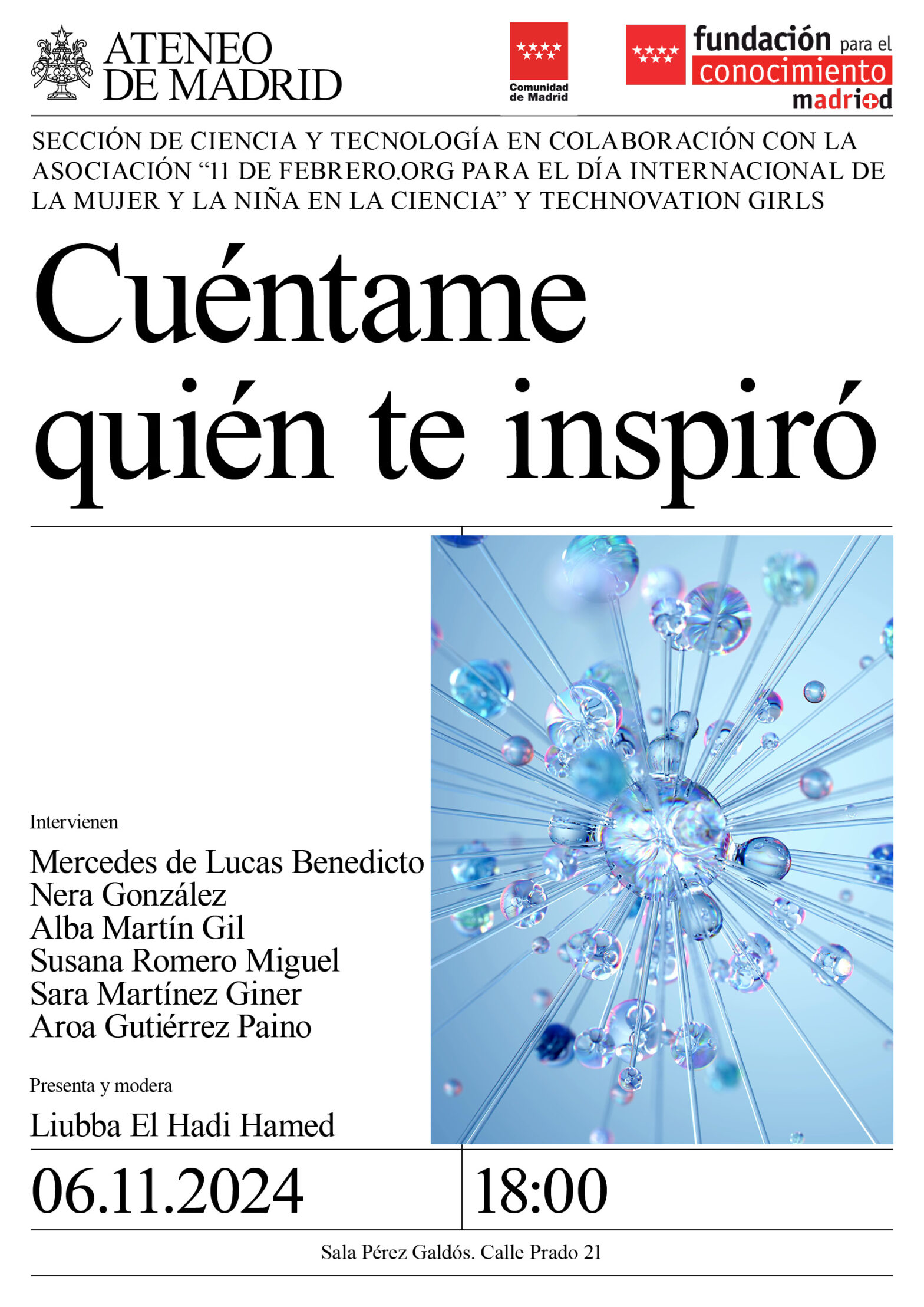 Sección de Ciencia y Tecnología en colaboración con la Asociación «11 de Febrero.org para el día Internacional de la Mujer y la Niña en la Ciencia» y Technovation Girls. Intervienen: Mercedes de Lucas Benedicto, coordinadora de la asociación 11f.org; Nera González, embajadora de Technovation Girls Madrid; Alba Martín Gil, profesora y doctora en óptica en la UCM; Susana Romero Miguel, ingeniera química, y profesora Máster PRL UOC; Sara Martínez Giner, ingeniera de telecomunicaciones, máster en en ciberseguridad; y Aroa Gutiérrez Paino, geóloga y máster en ingeniería medioambiental. Presenta y modera: Liubba El Hadi Hamed. Sala Pérez Galdós. 18:00h.