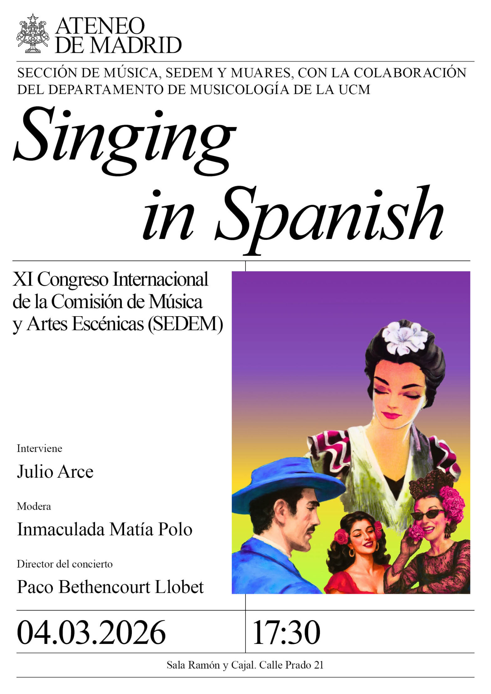 La música española en las producciones hollywoodienses durante los primeros años del sonoro. XI Congreso Internacional de la Comisión de Música y Artes Escénicas (SEDEM). Sección de Música, SEdeM y MUARES, con la colaboración del Departamento de Musicología de la UCM. Interviene: Julio Arce, profesor titular del Departamento de Musicología de la Universidad Complutense de Madrid . Modera: Inmaculada Matía Polo, vicedecana de Relaciones Internacionales, Institucionales y Biblioteca de la Facultad de Geografía e Historia (UCM) y profesora titular del Departamento de Musicología en la Universidad Complutense de Madrid. Director del Concierto: Paco Bethencourt Llobet, musicólogo-guitarrista, profesor de la UCM. Sala Ramón y Cajal. 17:30h.