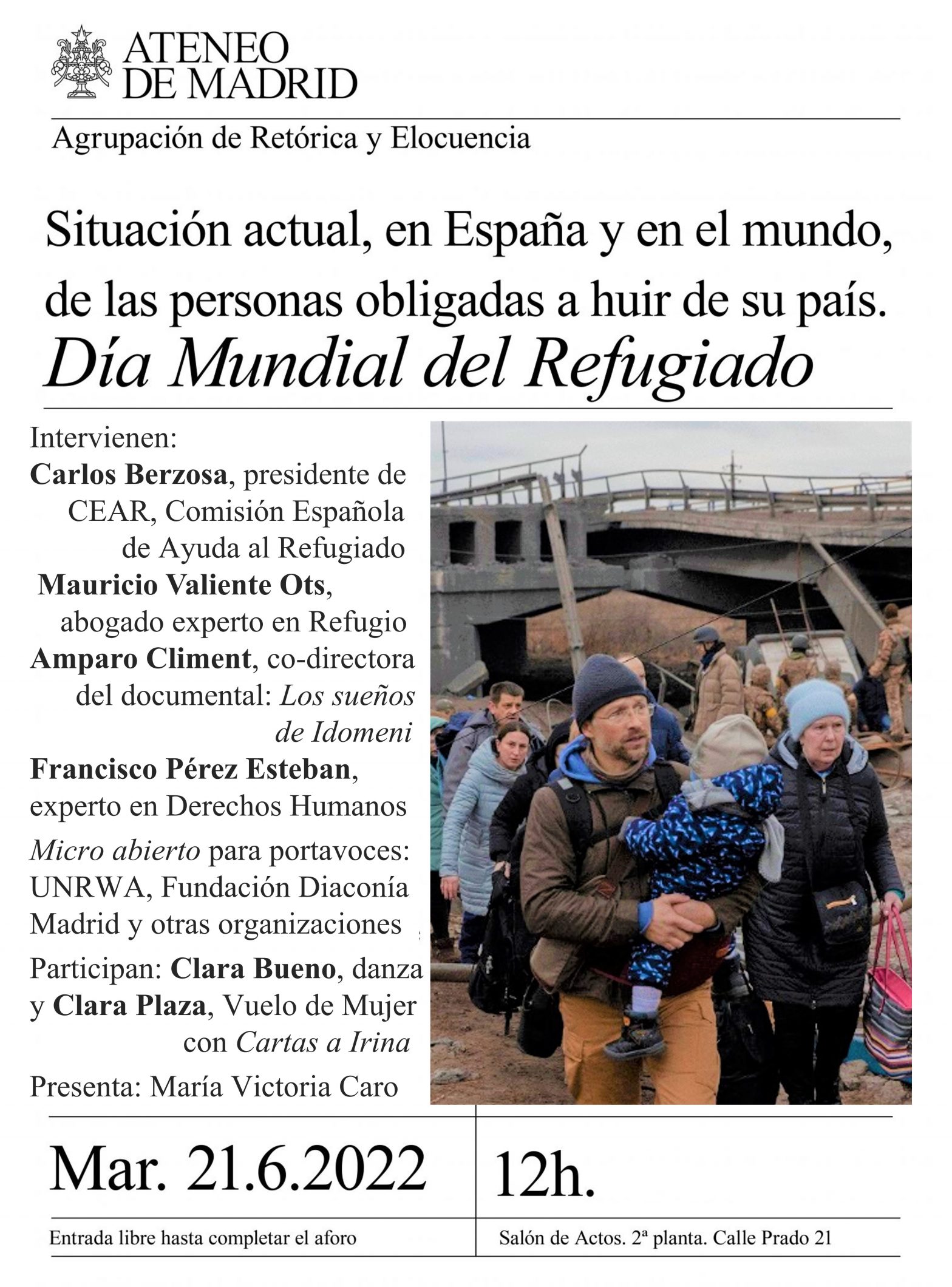Agrupación de Retórica y Elocuencia. Situación actual, en España y en el mundo, de las personas obligadas a huir de su país. Día Mundial del Refugiado. Intervienen: Carlos Berzosa, presidente de CEAR, Comisión Española de Ayuda al Refugiado, Mauricio Valiente Ots, abogado experto en Refugio  Amparo Climent, co-directora del documental: «Los sueños de Idomeni«, Francisco Pérez Esteban, experto en Derechos Humanos. Micro abierto para portavoces: UNRWA, Fundación Diaconía Madrid y otras organizaciones. Participan: Clara Bueno, danza, y Clara Plaza, de Vuelo de Mujer, Cartas a Irina, ante la rusofobia. Presenta y modera: María Victoria Caro Bernal. Salón de Actos.12:00 h.