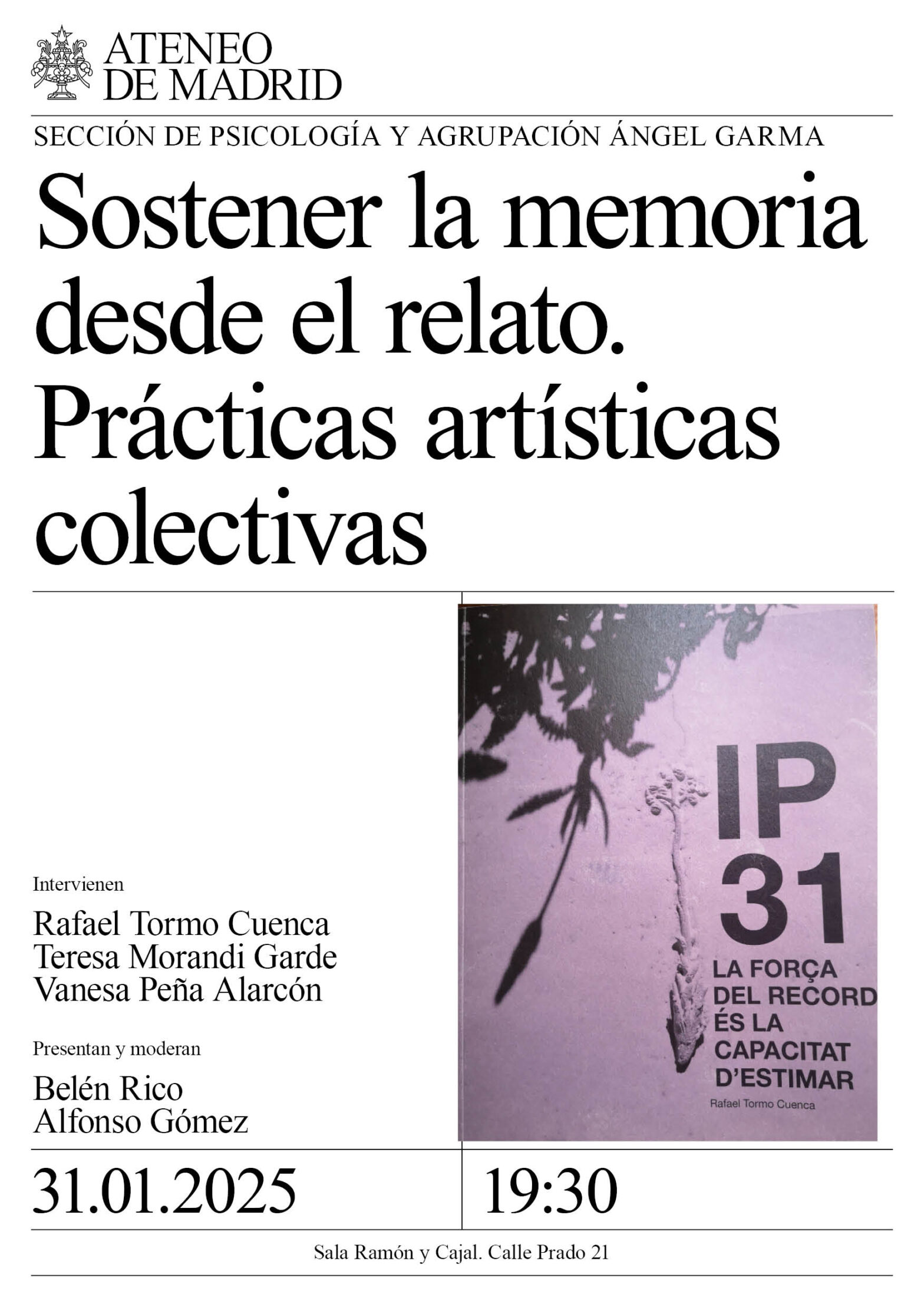 Sección de Psicología y Agrupación Ángel Garma. Intervienen: Rafael Tormo Cuenca, productor cultural, editor, artista y comisario y Teresa Morandi Garde, psicóloga clínica y psicoanalista; Vanesa Peña Alarcón. Presentan y moderan: Belén Rico y Alfonso Gómez. Sala Ramón y Cajal. 19:30h.