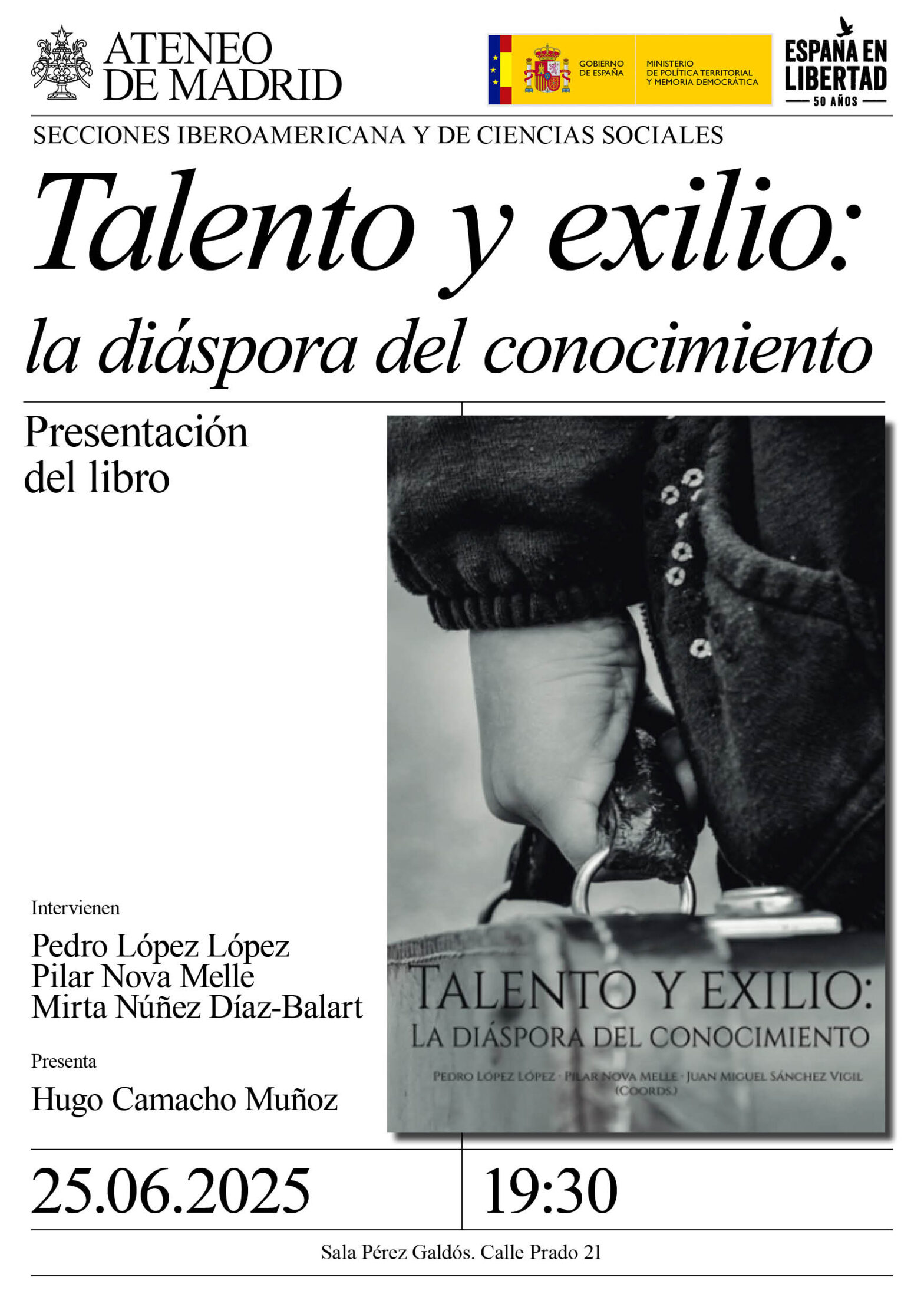 Secciones Iberoamericana y de Ciencias Sociales. Pedro López López, licenciado en Ciencias Políticas y Sociología, doctor en Psicología, exdirector de la Facultad de Biblioteconomía y Documentación de la UCM; Pilar Nova Melle, doctora en Sociología, cofundadora de Sociólogos sin Fronteras, presidenta de la Asociación de Descendientes del Exilio Español (ADEE); Mirta Núñez Díaz -Balart, historiadora, exdirectora de la Cátedra de Memoria Histórica de la Universidad Complutense de Madrid. Presenta Hugo Camacho Muñoz. Sala Pérez Galdós. 19:30h.