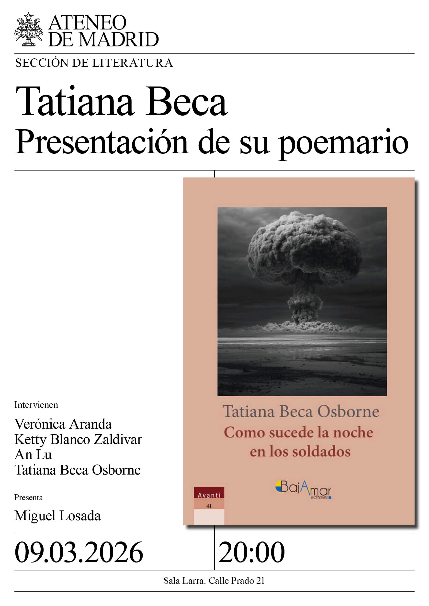 Sección de Literatura. Intervienen: Verónica Aranda; Ketty Blanco Zaldivar, poeta y narradora; An Lu es el nombre con el que Laura Szwarc da cuenta de su poesía; Tatiana Beca Osborne, poeta. Presenta: Miguel Losada. Sala Larra. 20:00h.