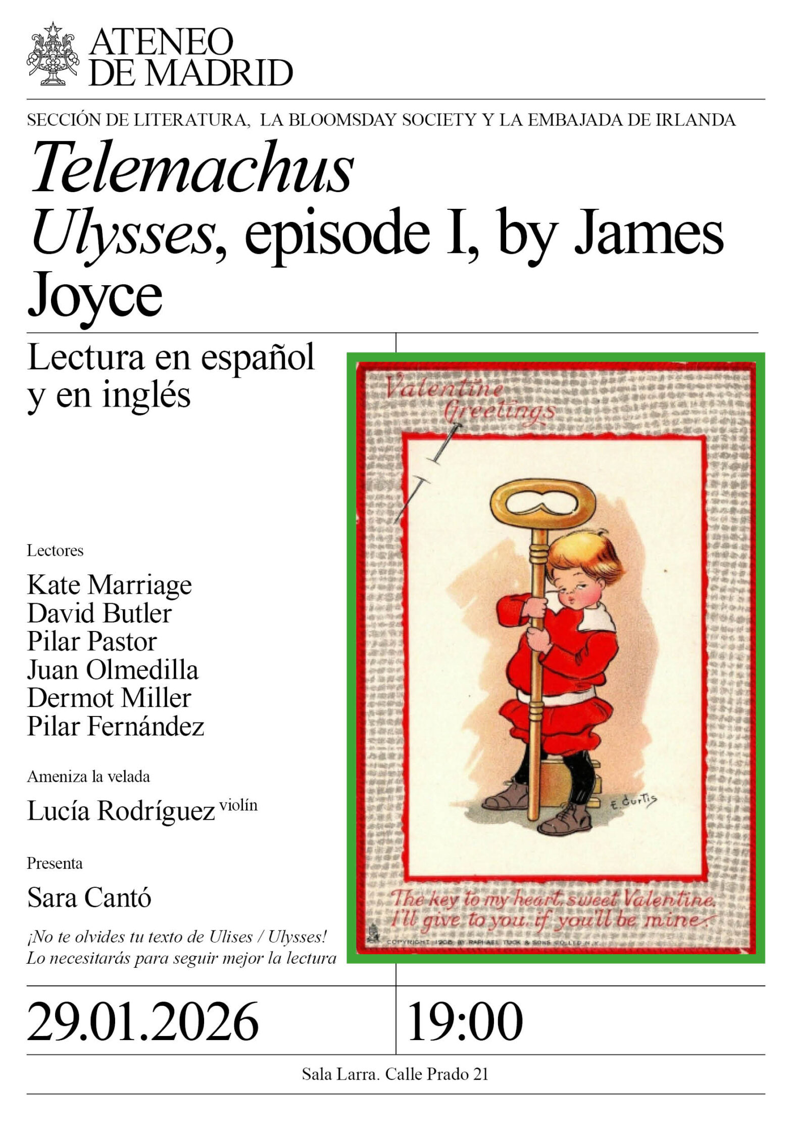Sección de Literatura, Blommsday Society y la Embajada de Irlanda. Lectores: Kate Marriage, David Butler, Pilar Pastor, Juan Olmedilla, Dermot Miller y Pilar Fernández. Ameniza la velada: Lucía Rodríguez, violín. Presenta: Sara Cantó. Sala Larra. 19:00h.