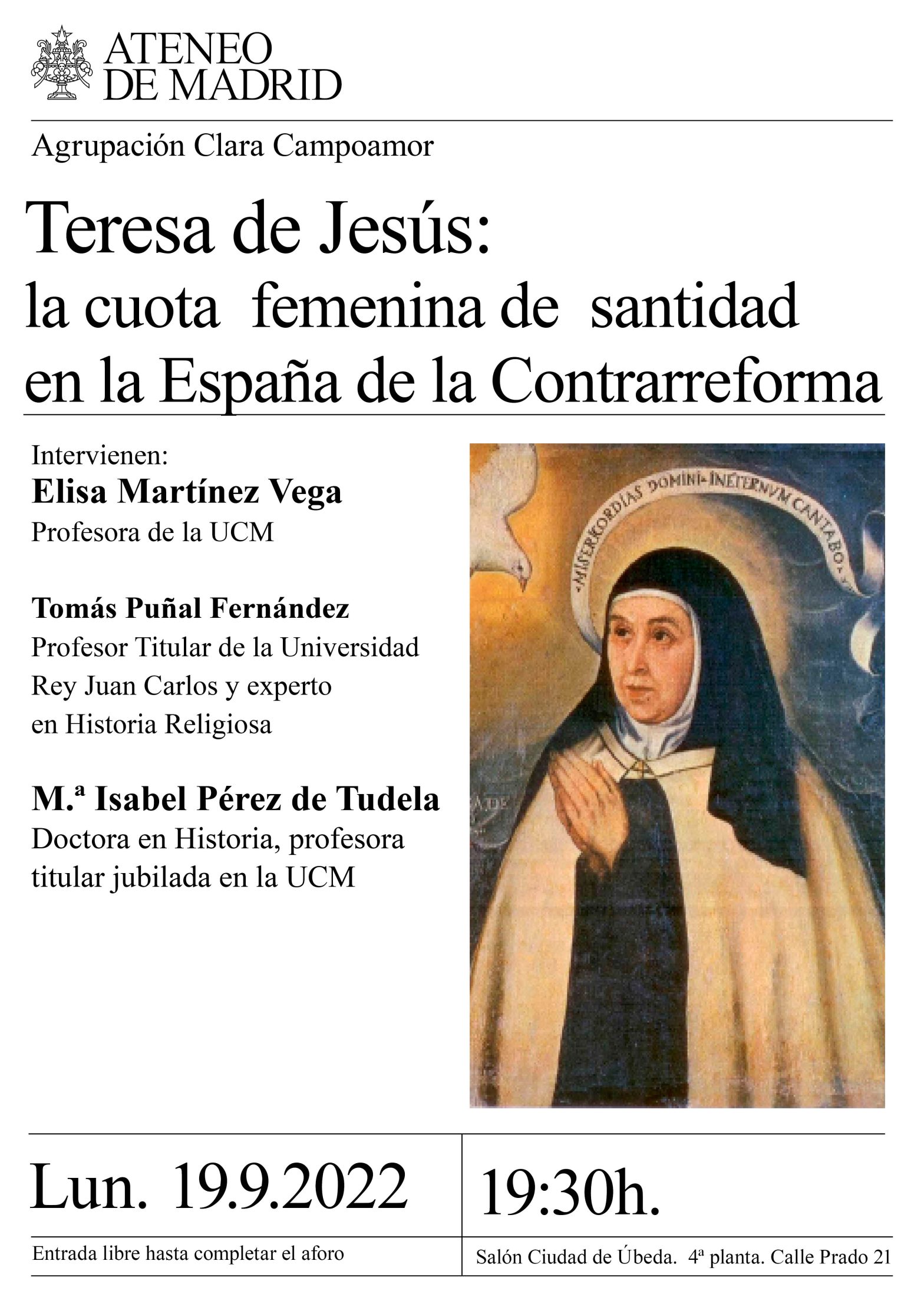Agrupación Clara Campoamor. Intervienen: Elisa Martínez Vega profesora de la UCM, Tomás Puñal Fernández, Profesor Titular de la Universidad Rey Juan Carlos y experto en Historia Religiosa y M.ª Isabel Pérez de Tudela, Doctora en Historia, Profesora Titular Jubilada en la Universidad Complutense de Madrid. Modera Margarita Fernández García. Salón Ciudad de Úbeda. 19.30 h.