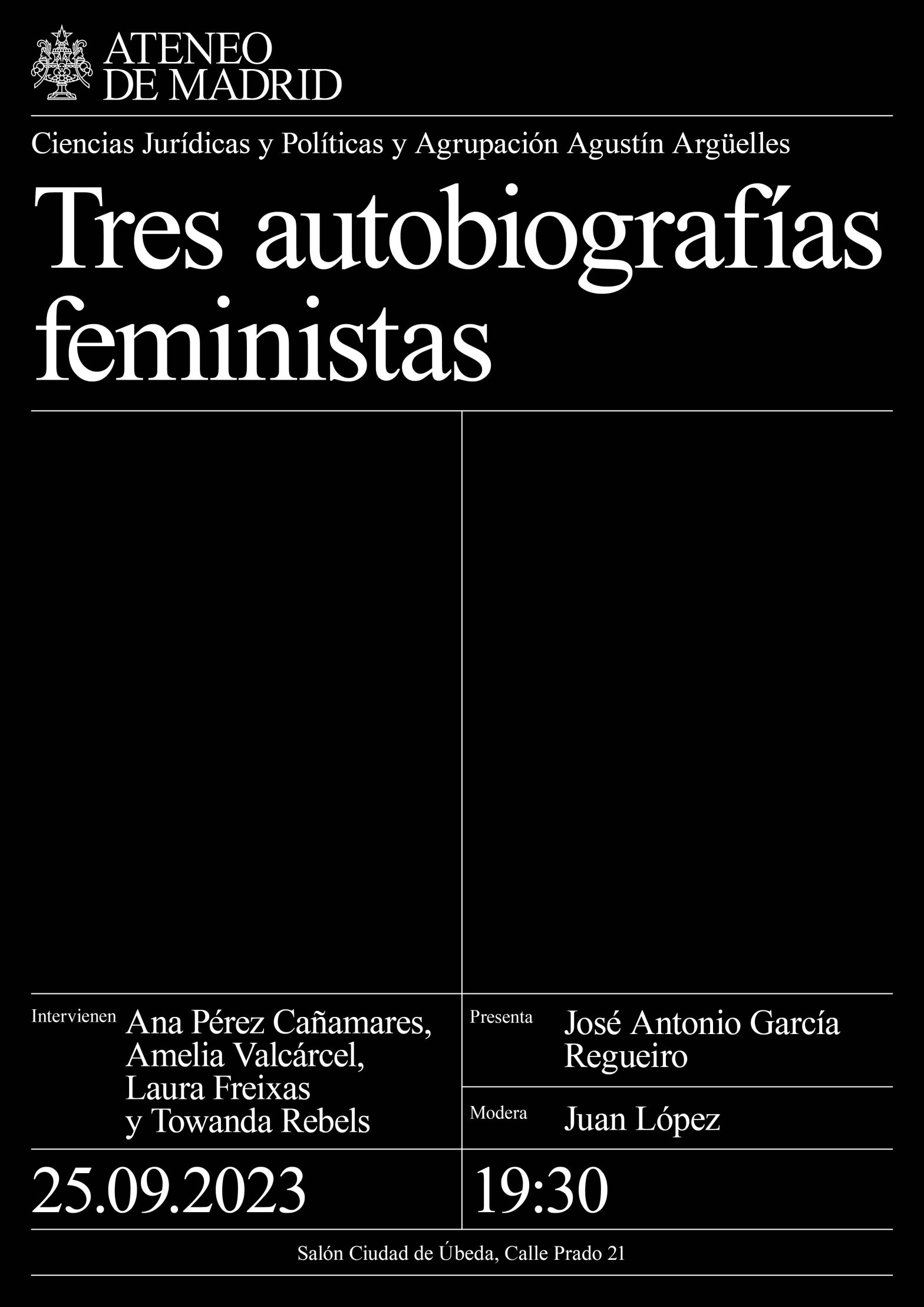 Sección de Ciencias Jurídicas y Agrupación Agustín Argüelles. Intervienen: Amelia Valcárcel, catedrática de Filosofía Moral y Política en la UNED; Laura Freixas, fundadora en 2009 de la Asociación “Clásicas y Modernas”; Ana Pérez Cañamares, licenciada en Filología Hispánica; Towanda Rebels, artista. Presenta: José Antonio García Regueiro. Modera: Juan López. Salón Ciudad de Úbeda. 19:30h.
