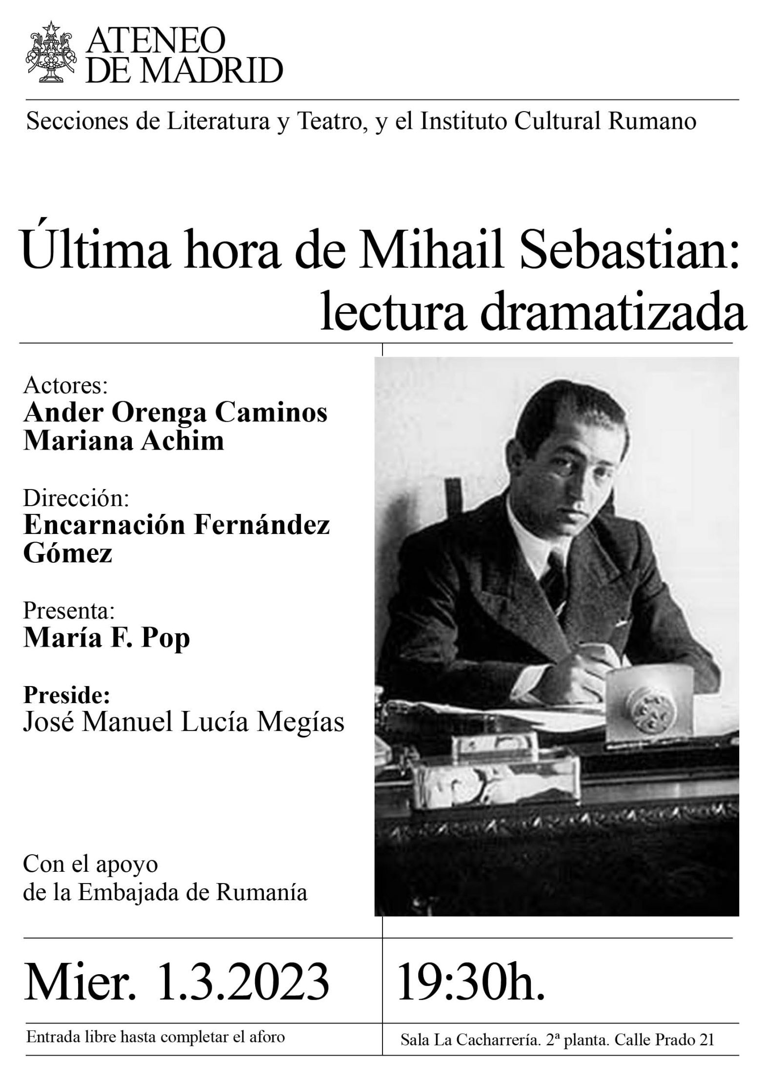 Sección de Literatura. Actores: Ander Orenga Caminos y Mariana Achim. Dirección: Encarnación Fernández Gómez. Presenta: María F. Pop. Preside: José Manuel Lucía Megías. Con el apoyo de la Embajada de Rumanía. Sala La Cacharrería. 19:30h.
