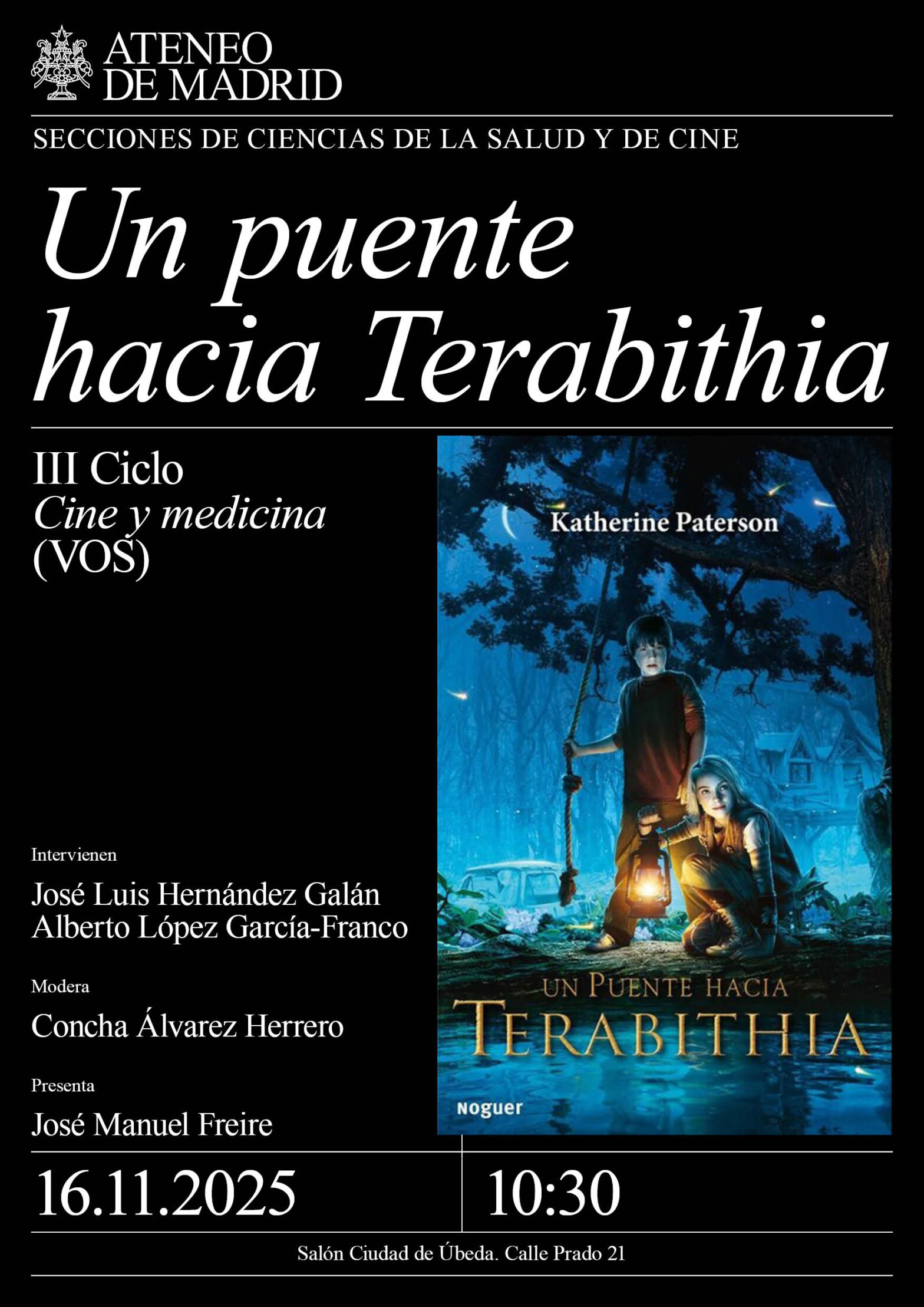 Sección Ciencias de la Salud y de Cine. Intervienen: José Luis Hernández Galán y Alberto López García-Franco. Modera: Concha Álvarez Herrero. Presenta: José Manuel Freire. Salón Ciudad de Úbeda. 10:30h.