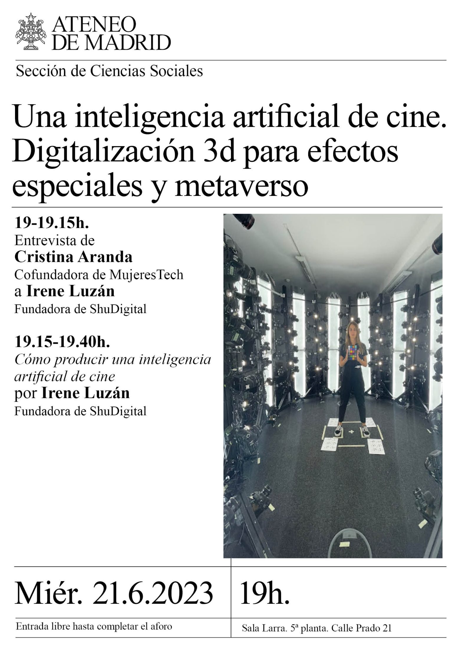 Sección de Ciencias Sociales. 19 – 19.15h. Entrevista de Cristina Aranda (cofundadora de MujeresTech) a Irene Luzán (Fundadora de ShuDigital). 19.15-19.40h. Cómo producir una inteligencia artificial de cine por Irene Luzán (Fundadora de ShuDigital). Sala Larra. 19h.