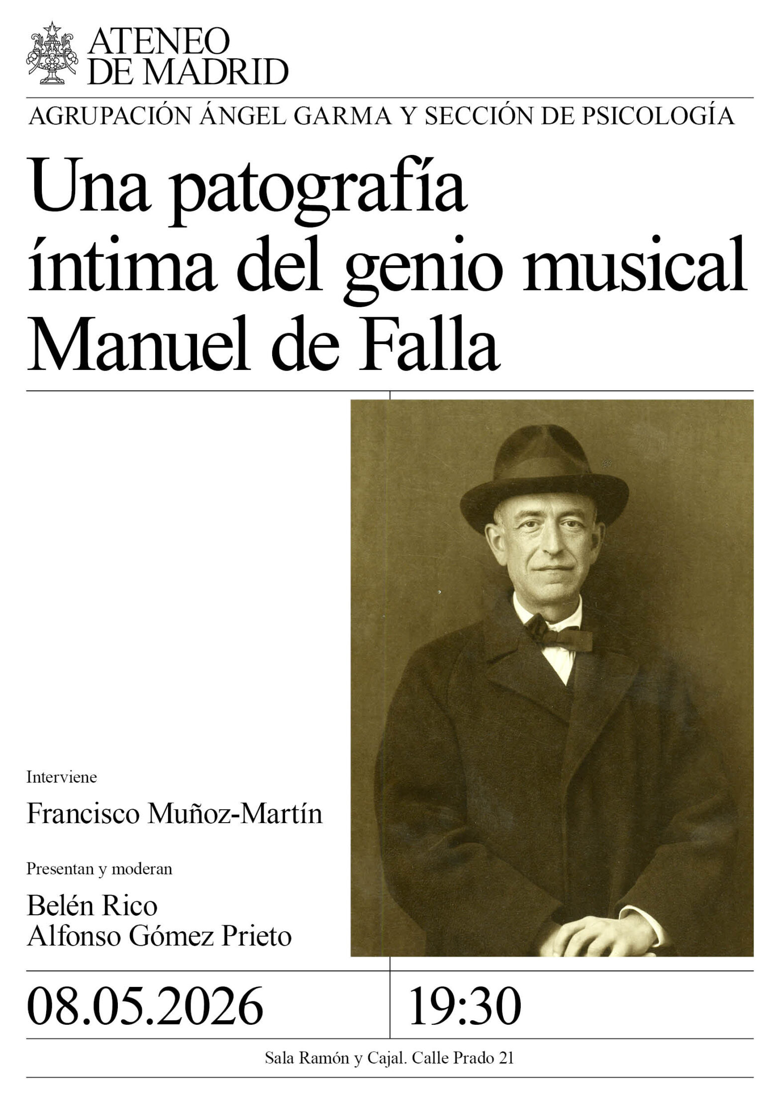 Agrupación Ángel Garma y Sección de Psicología. Interviene: Francisco Muñoz-Martín, doctor en Psicología. Psicoanalista, miembro titular con función didáctica de la Asociación Psicoanalítica de Madrid, de la Federación Europea de Psicoanálisis y de la Asociación Internacional de Psicoanálisis. Presentan y moderan: Belén Rico y Alfonso Gómez. Sala Ramón y Cajal. 19:30h.
