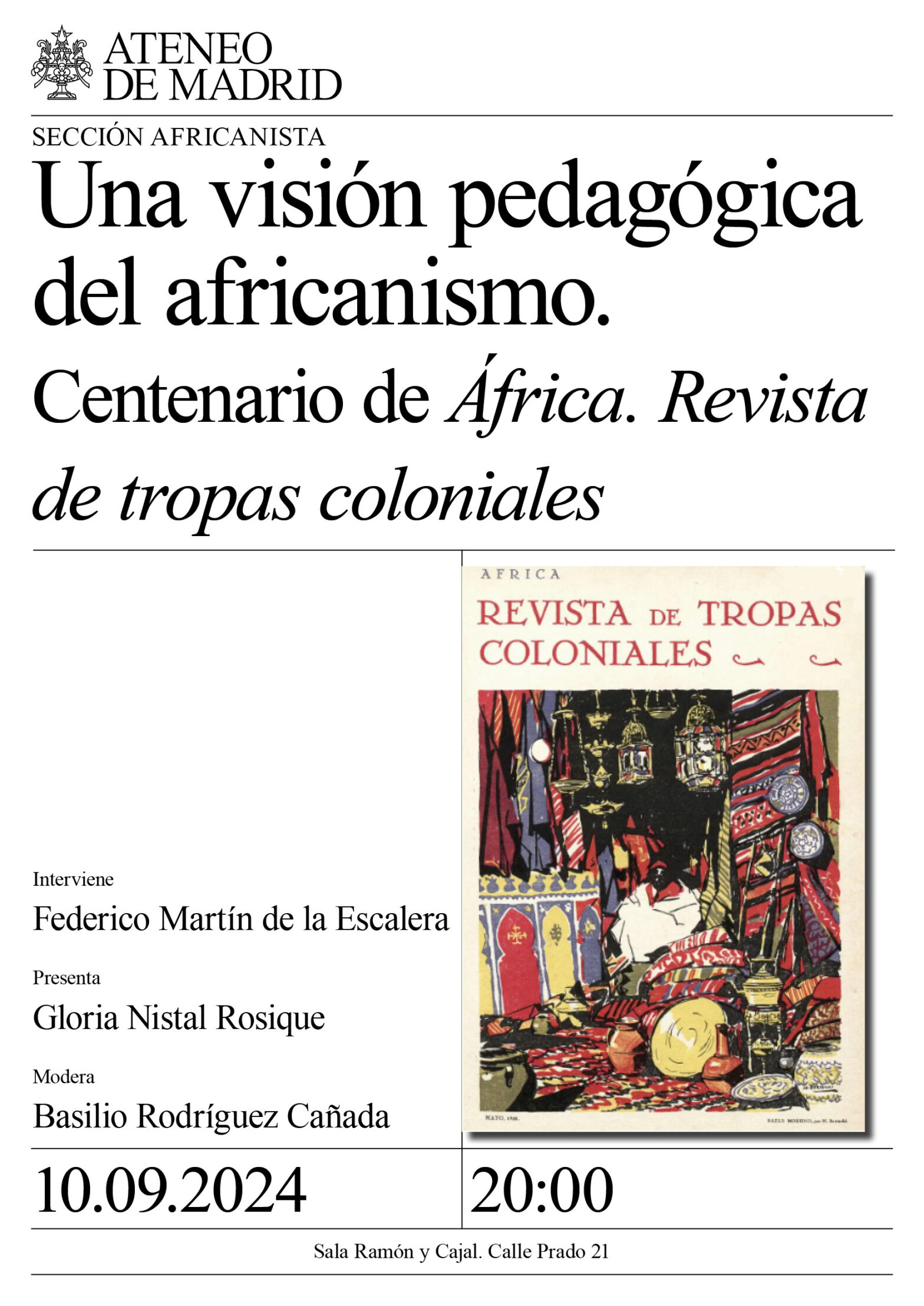Sección Africanista. Interviene: Federico Martín de la Escalera, doctor ingeniero de minas. Presenta: Gloria Nistal Rosique. Modera Basilio Rodríguez Cañada. Sala Ramón y Cajal. 20:00h.